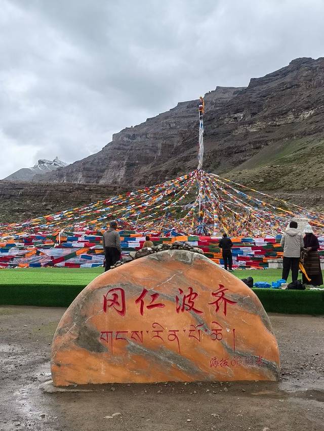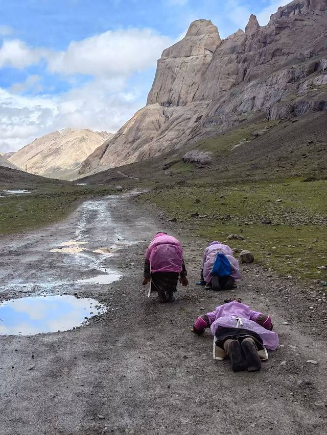 雨幕中的转山道像幅未干的水墨长卷。前八公里缓坡上,经幡隧道被雨水浸透,朱红、明黄、宝蓝的布条纠缠着垂落,在风中相互拍打发出猎猎声响。迎面而来的朝圣者队伍里,有位磕长头的老人格外醒目。他的牛皮围裙早已磨得发亮,包铁的木掌板撞击碎石迸出火星,每次俯身贴地时,花白胡须都浸在泥水里。当我们目光相触的刹那,他忽然露出孩童般的笑容:“扎西德勒”被雨水冲刷的皱纹里流淌着令人心颤的澄明。