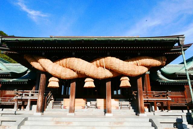 宫地嶽神社的建筑特色包括其主殿和八个“里神社”,这些建筑坐落于山头上。神社内还藏有日本之最的物品:长11米、直径2.6米、重3吨的大注连绳;此外,宫地嶽神社最著名的景点是“光之道”,每年2月和10月,夕阳会穿过神社的参道,在海面上形成一条金色光路