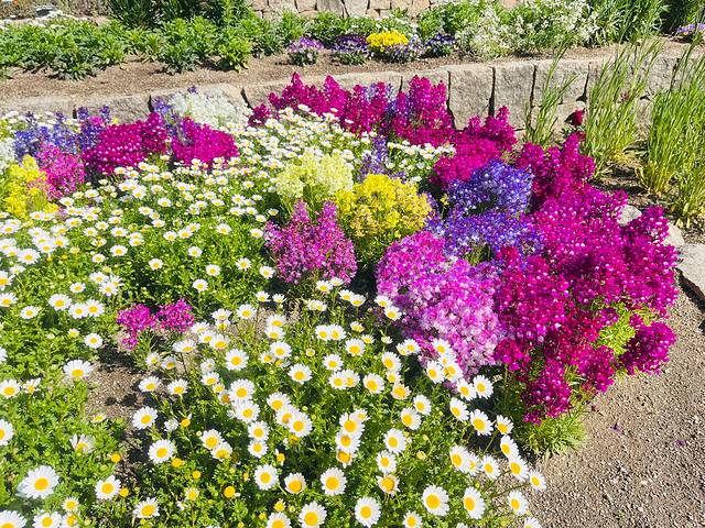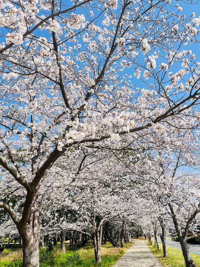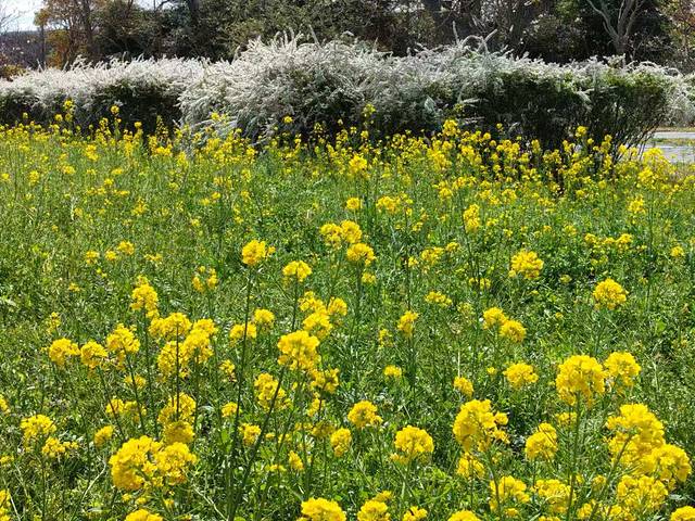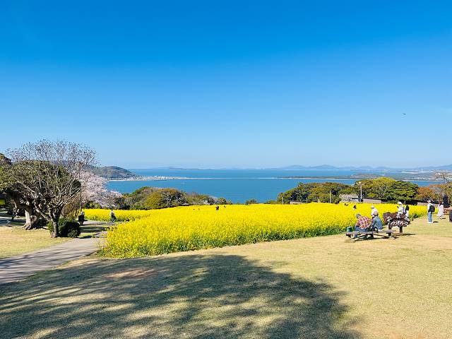 能古岛上的海岛公园除了是春季赏樱的好去处,四季均有花卉可赏;而二月至四月,正是油菜花盛开的季节。在面朝大海的视野中,蔚蓝的天空下,一大片延绵的油菜花,黃澄澄地正往上伸展。