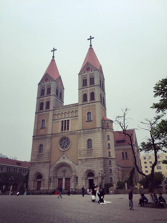 天主教堂平面呈十字形,教堂主体两翼,各耸一座尖塔,塔高56米,顶端各立有一个4.5米高的巨型十字架。大厅高18米,可纳千人,内部采用意大利文艺复兴时期的装饰,穹顶绘以圣像壁画。天主教堂是青岛地区最大的天主教堂和哥特式建筑,也是中国唯一的祝圣教堂。