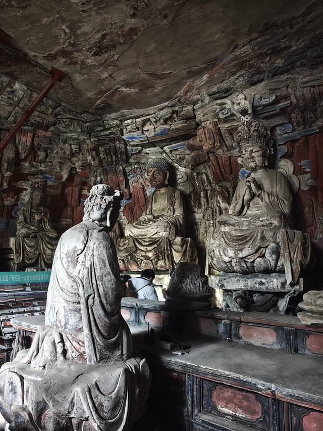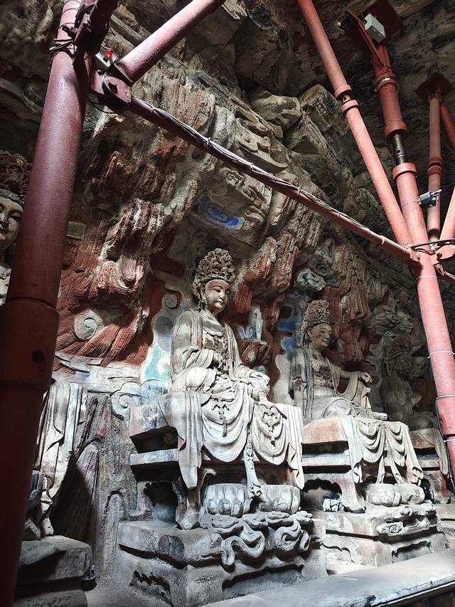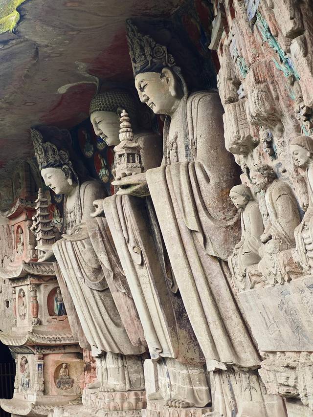 🗿 巨像奇观:毗卢遮那佛(高7米)与文殊、普贤 菩萨 ,衣袖下垂近2米,悬空支撑千年不坠,展现宋代力学智慧。