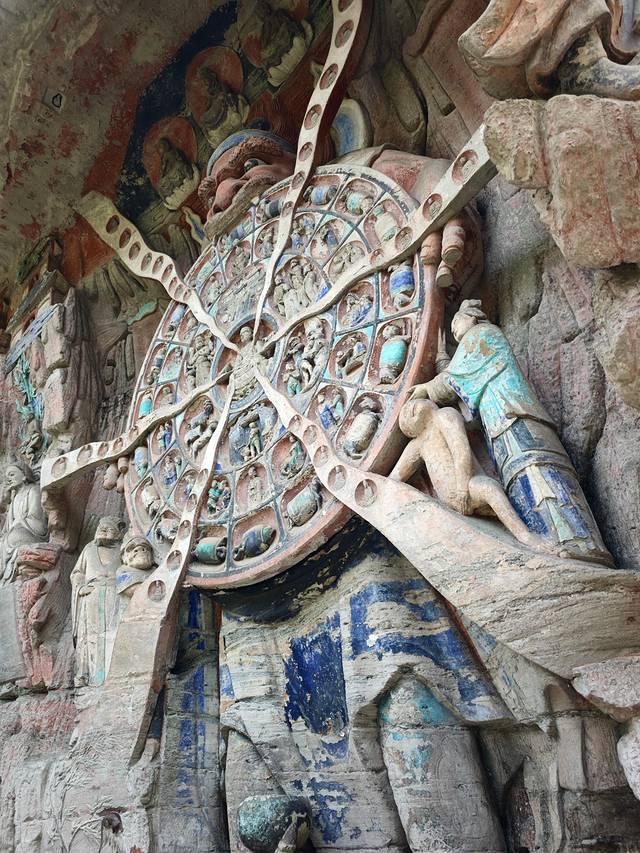 📿佛教寓意:巨型浮雕,直径7米,中心为转轮王手持“六道轮”,象征众生在天道、人道、阿修罗道、畜生道、饿鬼道、地狱道中轮回。