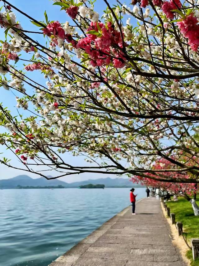 白堤横卧西湖碧波上,似一条缀满春色的绸带。春日里,桃花灼灼如胭脂轻染,粉瓣随风飘落;垂柳依依似绿帘轻摇,嫩芽拂过湖面。花与柳携手织就烂漫画卷,漫步其间,脚下石板温润,耳畔莺啼婉转,满是西子湖畔的温柔絮语。