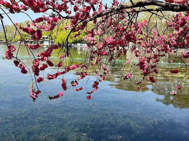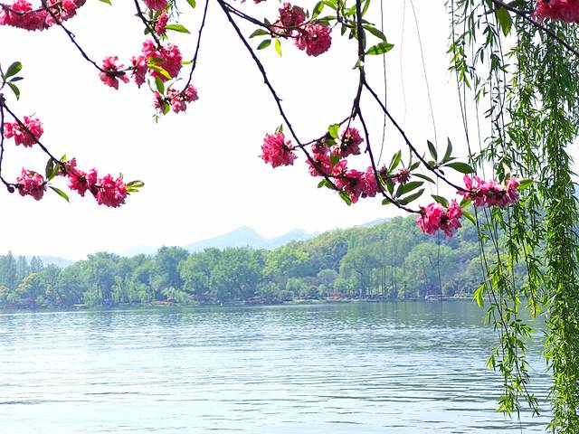 白堤在四月是一年中最美的季节,因为到处都是桃红柳绿。提到苏堤春晓,以前,我们都以为苏堤是桃红柳绿的真实,其实,真实的桃红柳绿是在白堤。