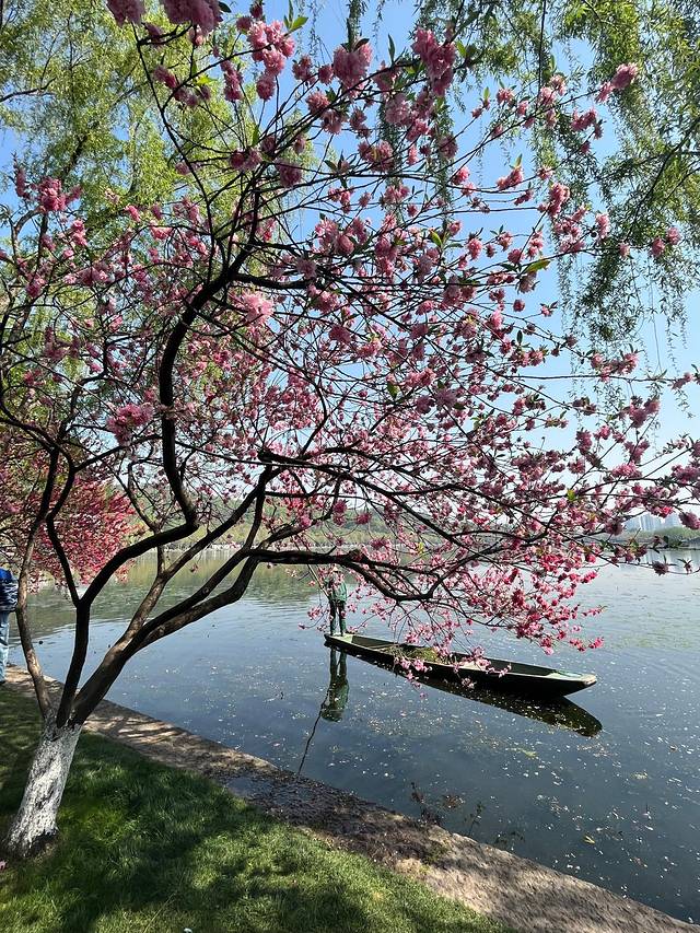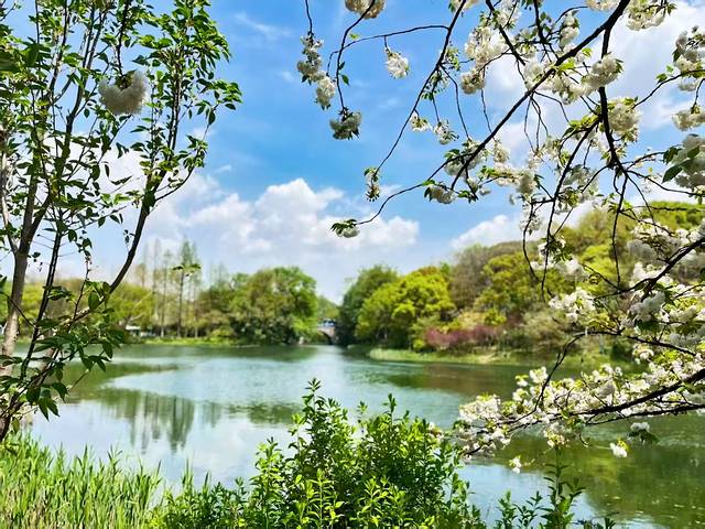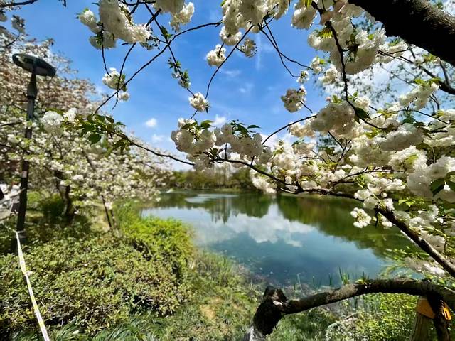 今年去的时间晚了点,只看到了白色的晚樱。记得以前,看到大片大片的粉色樱花,樱花簌簌落于粼粼水面。粉瓣轻吻涟漪,倒影摇曳似梦境舒展,水色天光拥抱着温柔的絮语,静守一湾缱绻春意。
