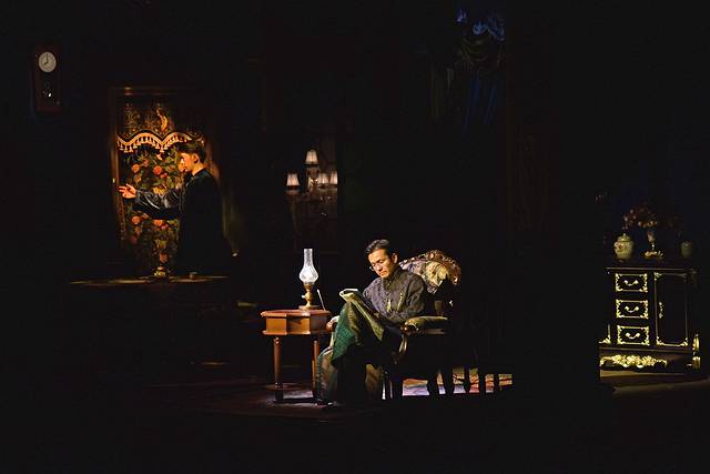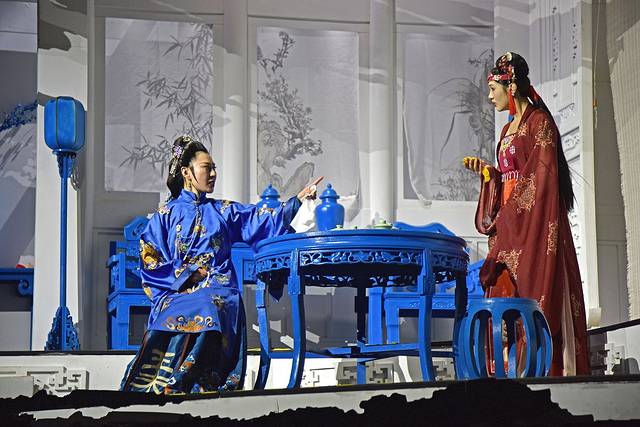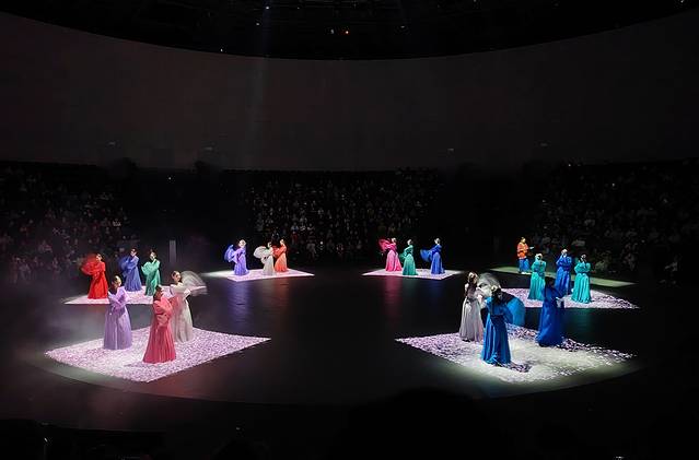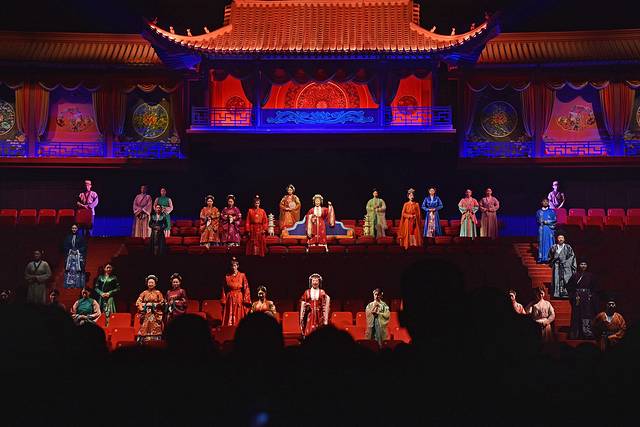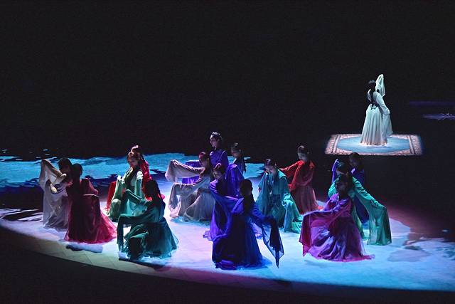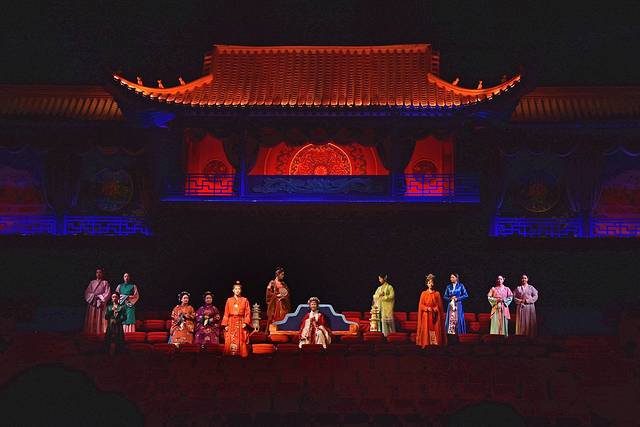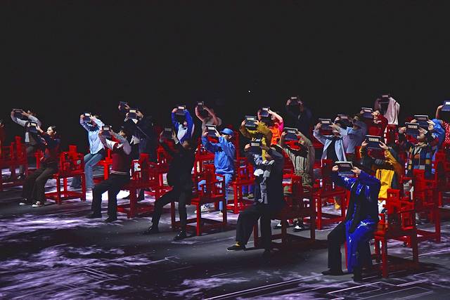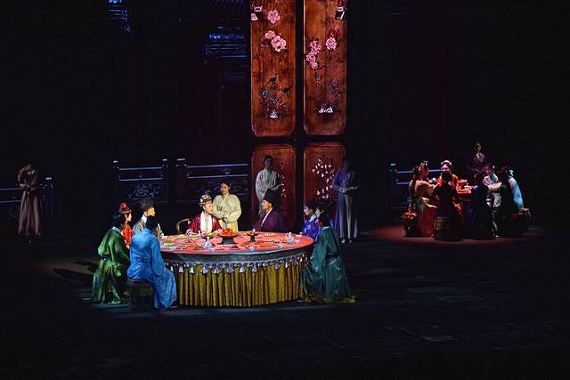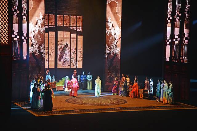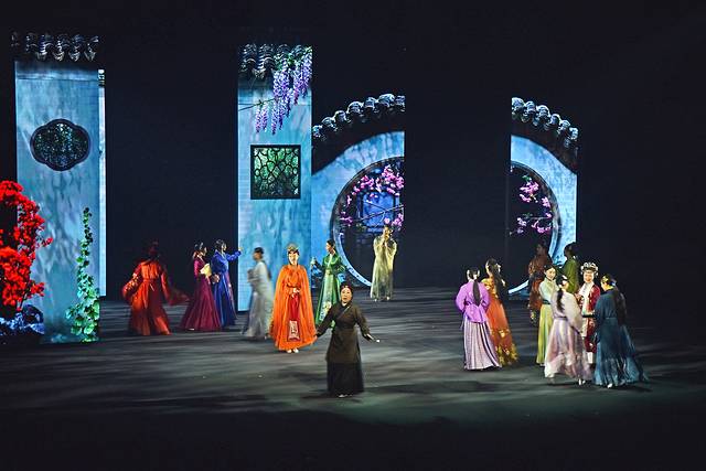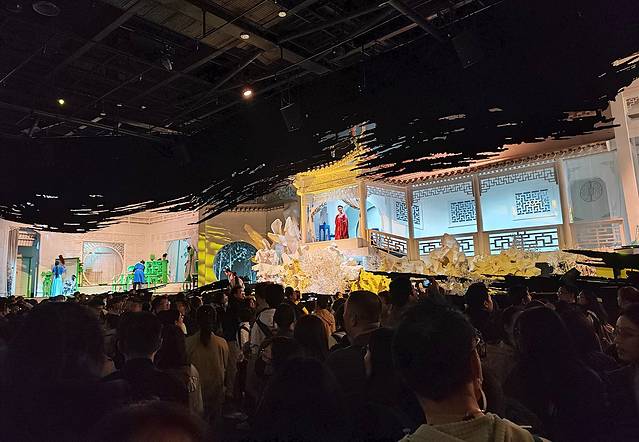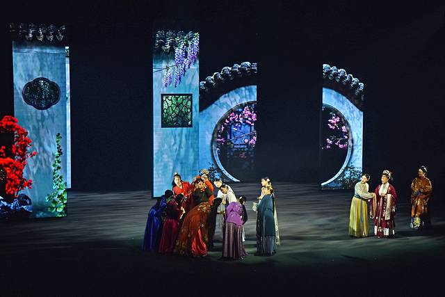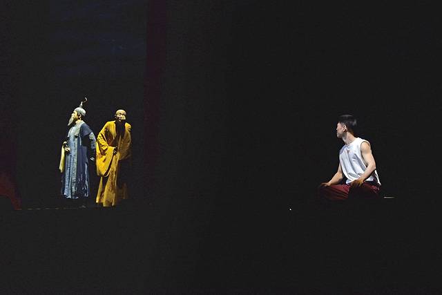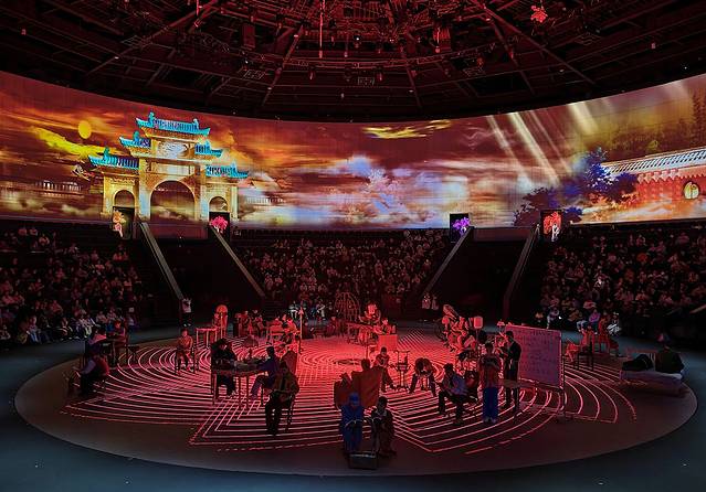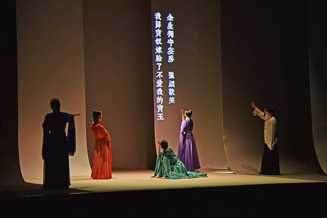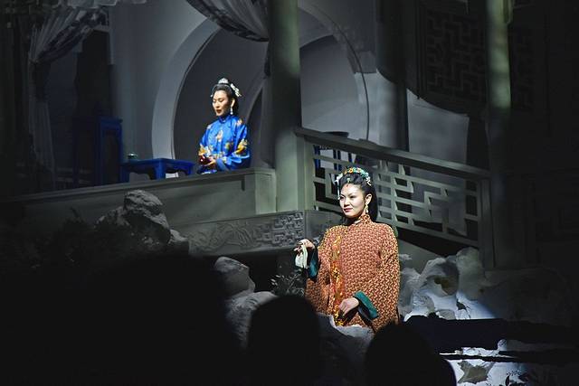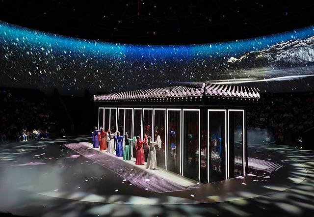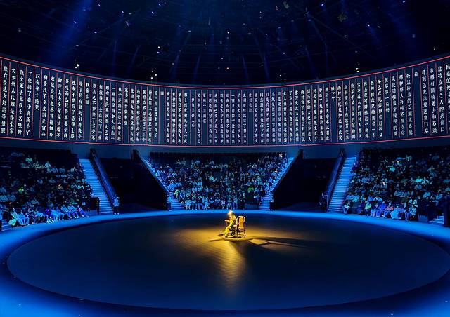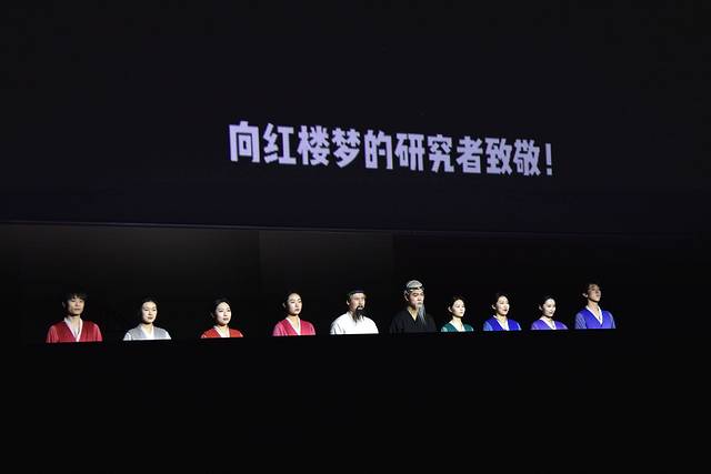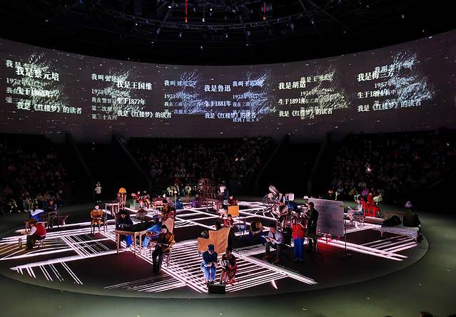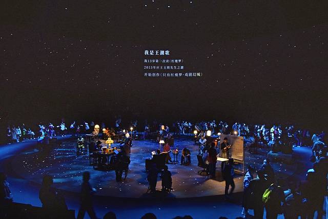 《只有红楼梦》与景区同名,可以放在后面作为压轴大戏看。观众环绕四周,舞台则设置在剧场中央,每一次灯光熄灭,道具、场景在黑场中迅速切换。来自不同时代,不同地点,不同身份的读者,不同的片段,不同的感悟在此交织碰撞,光影变幻惊奇,舞台效果震撼,当导演王潮歌的声音想起,名字出现在大屏幕上,瞬间将情绪推向高峰。
