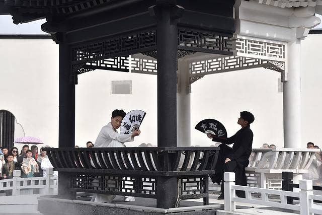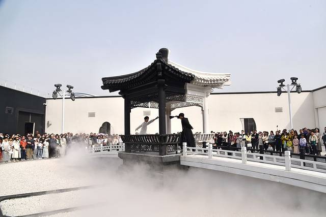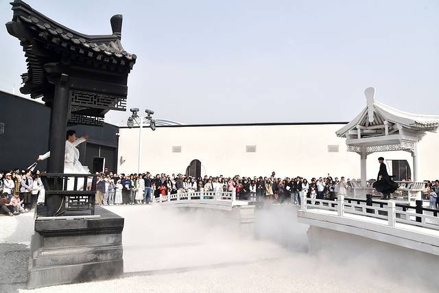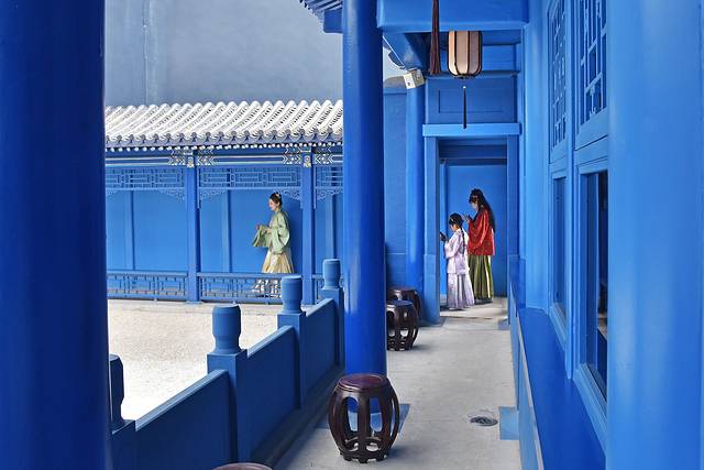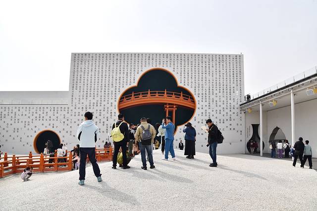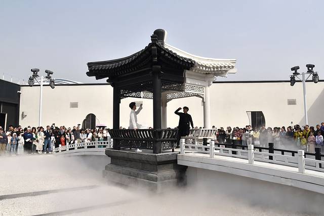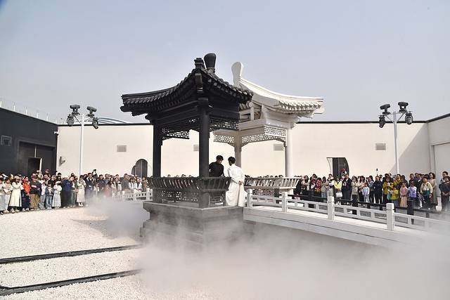 看一个节目,逛几个园子拍拍照,再排队看下一场演出,这是逛戏剧幻城基本的节奏。景区整体是一座方城,用道路与墙分隔成或大或小网格式的小方格,每个方格是一个独立的空间,通过富有想象的设计,形状各异的门洞、天窗,营造出108个各具风格的园林空间,奇幻的、古典的,年代感的……中式审美的含蓄、内敛、端庄与梦境的玄妙、空灵、虚无在一个个空间中或顺次或同框,大面积的留白,给人无限想象的空间。穿上一身唐装、汉服或是旗袍、马面裙,配合年代场景,拍出的画面更有味道。拍照只是佐料,看演出才是正菜。