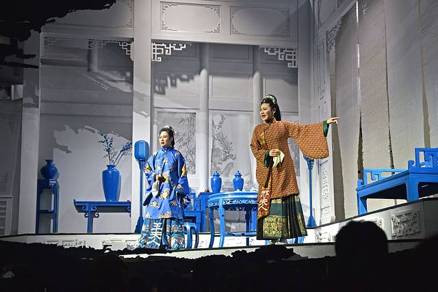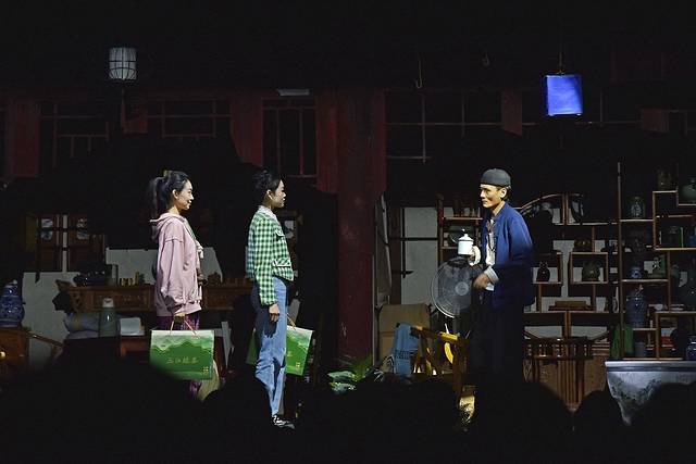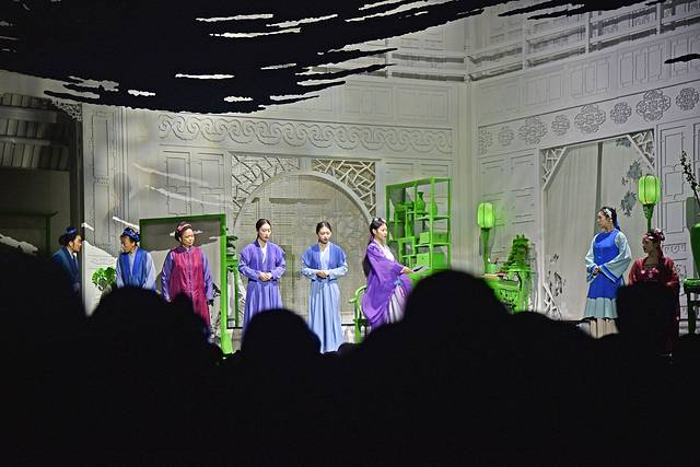《真亦假》剧场为行进式演出,观众从后台进入,目睹道具间、化妆间到演员们备场的过程,观众与演员颠倒位置,体验站在舞台上被观看的场景,看剧中演员与书中人物跨越时空的对话,随后观众入座,贾府里的一场场大戏开演……