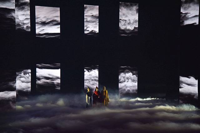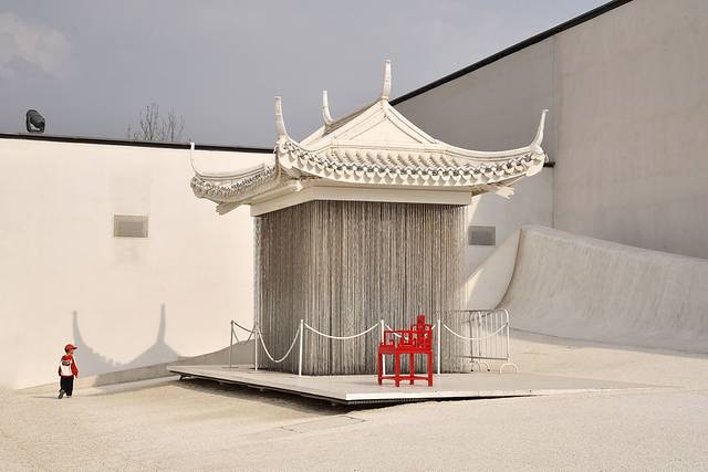 一黑一白,阴阳交错,两个人互为镜像,在时空偶遇,黑白各半的亭子时而分开,时而合拢,地面上蒸腾的云雾,给现场平添了几分玄幻离奇的氛围。