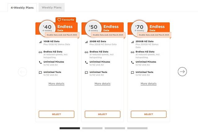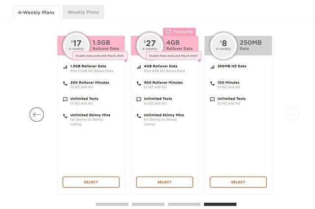 新西兰有四大主流运营商,分别是Spark、Skinny(Spark子公司)、Vodafone(One NZ)和Degrees。在比较了信号覆盖范围和性价比后,我选择了Skinny。Skinny共享Spark的基站,信号覆盖最广,尤其在南岛偏远地区表现稳定;同时他们家的价格最低,目前提供周套餐(20纽币/10GB流量+无限通话)和4周套餐(见下图),适合短期旅行。