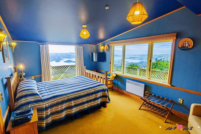 除了经济实惠的汽车旅馆,我在但尼丁和哈威亚湖特意安排了两晚“轻奢”体验。其中,但尼丁的拉纳克花园古堡(Larnach Castle)堪称一大亮点——作为新西兰唯一的城堡,它不仅是见证但尼丁历史的重要地标,更是游客必到的网红打卡地。这座古堡最特别之处在于,它在 临海 湾的一侧精心打造了12套风格独特的海景木屋(Larnach Lodge)。每间木屋都拥有专属主题设计,更坐拥180°无敌海景,让我一见倾心,毫不犹豫将其列入“必住”清单。多亏行前做足功课,预订时我直接向酒店提出了想要入住20号房的具体请求,最终成功拿下了这间心仪已久的海洋主题客房。