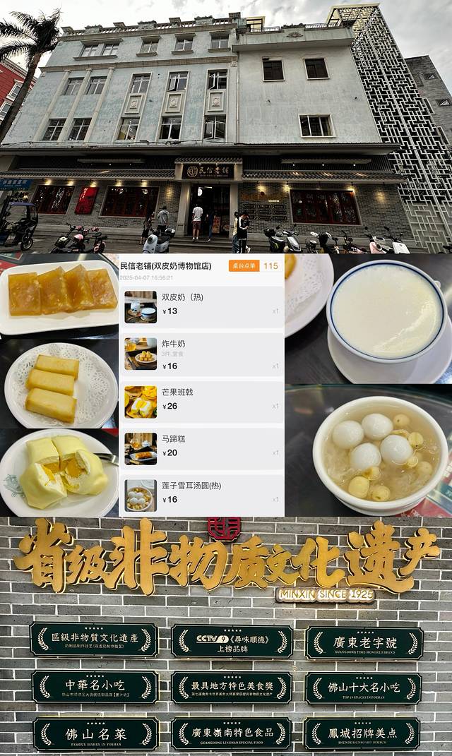 来到顺德,怎能错过美味的双皮奶,民信老铺(广东老字号/1930年)甜品店,以双皮奶为主。广东商务厅认定为“第一批广东老字号”,名气大,是佛山著名的老字号美食餐厅。