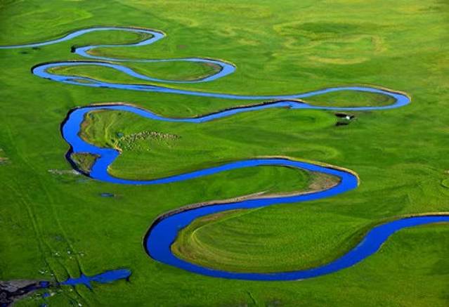 蓝色的河流镶嵌在草原上宛如一条彩带。
