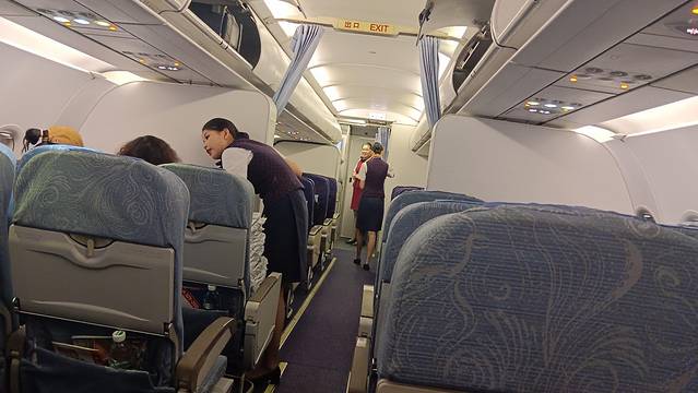 上飞机后,空姐询问各旅客的安全带有系好没,语气温柔,态度和气。