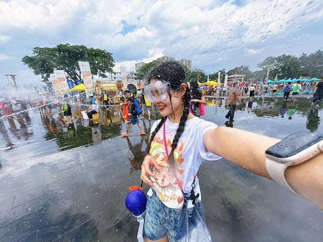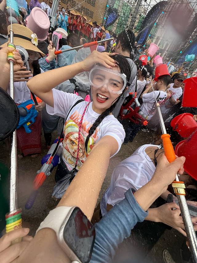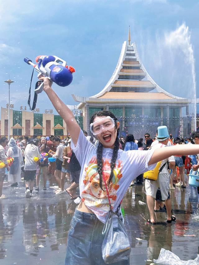 我跟随着舞台的主旋律一起舞动,音响中播放欢快的傣族歌曲,大家洒水跟随节拍跳跃,沉浸在欢乐的泼洒中。就算离开主战场,街头也一样热闹,街头混战:无差别“湿身”快乐。整座城市已化身“水战场”。皮卡车后备箱成了移动水库,商铺门口摆满“弹药库”(水桶和水气球),连路过的摩托车骑士也难逃“祝福”——一盆水迎面泼来,换来一阵爽朗的大笑。