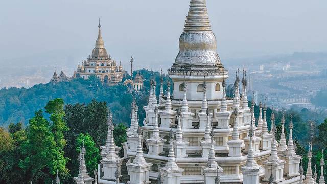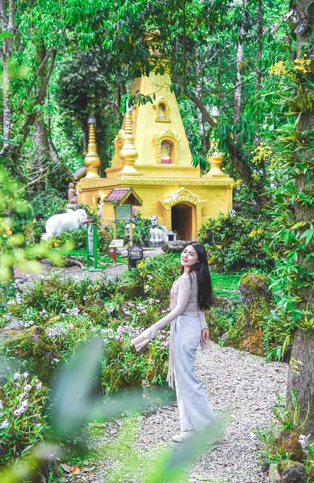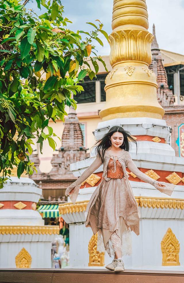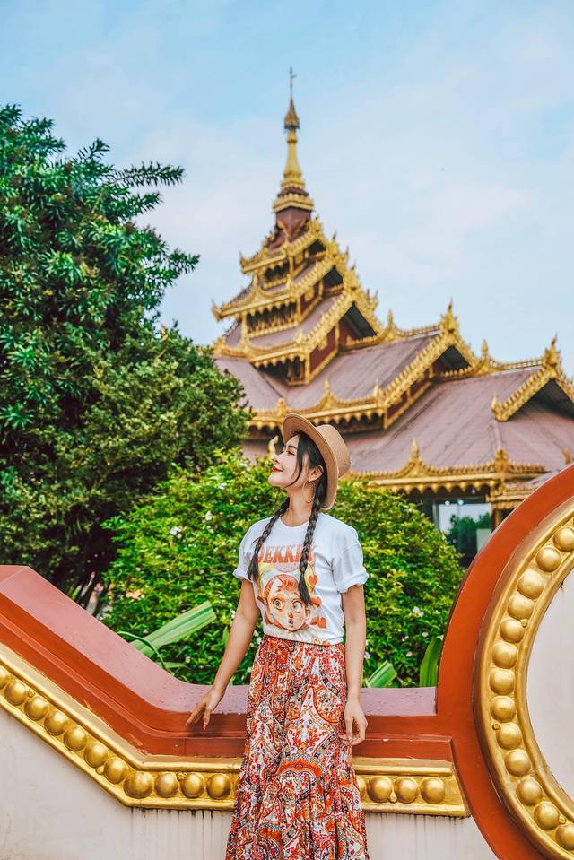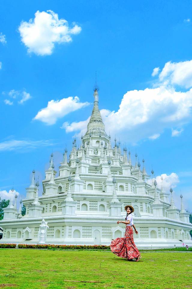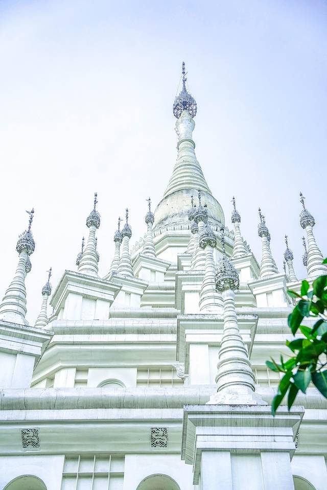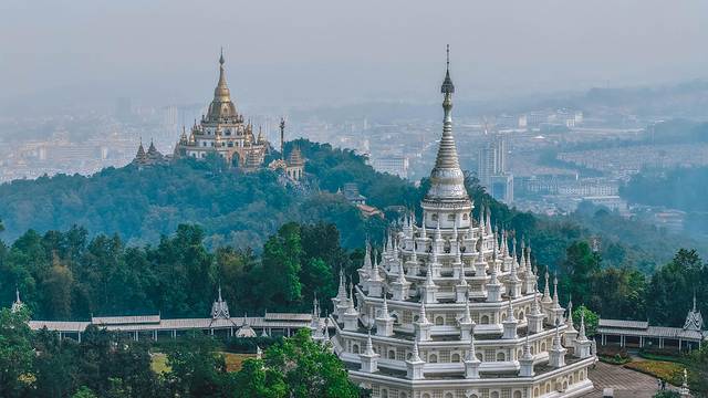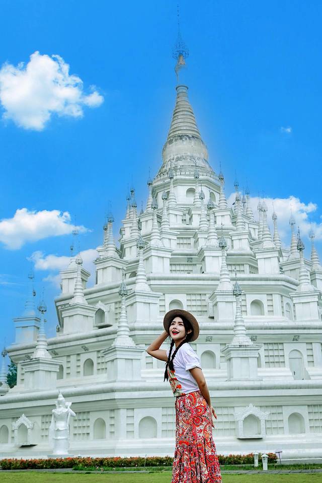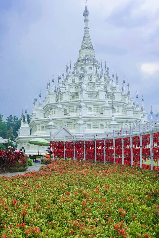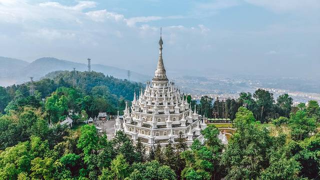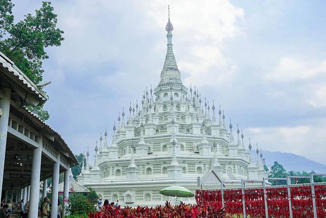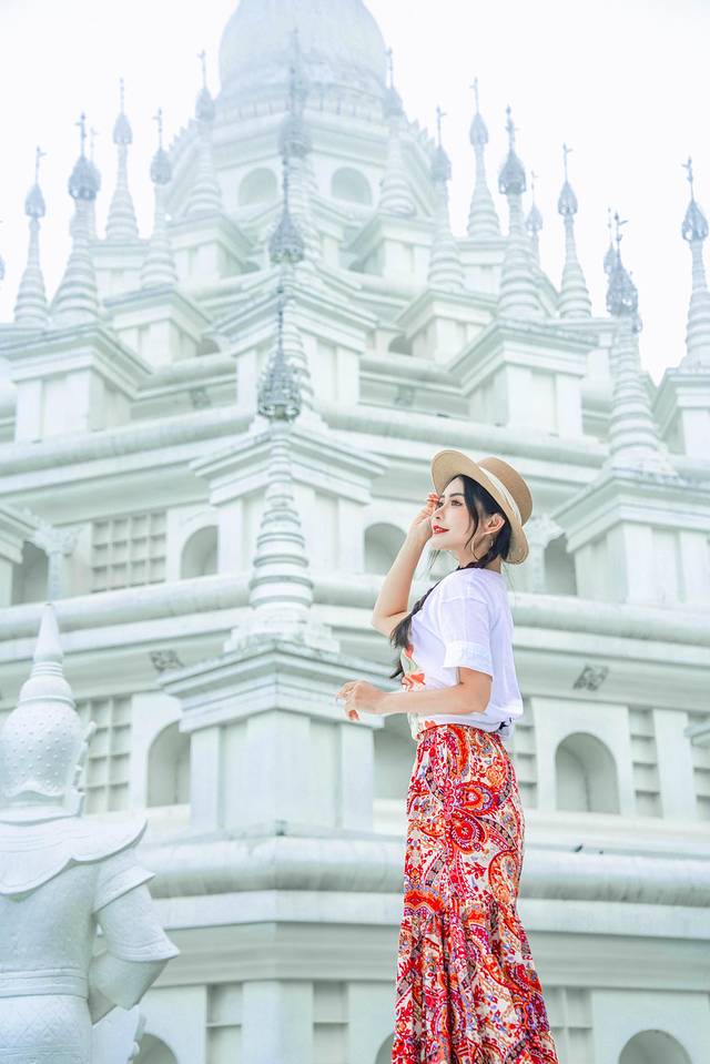 如果说芒市最出片的地方之一那绝对是白塔,如果想要拍银塔一定要赶早!坐着观光车沿着盘山公路蜿蜒而上,道路两侧的凤凰木正开着火红的花。转过最后一个弯道时,整座银塔突然闯入视野。