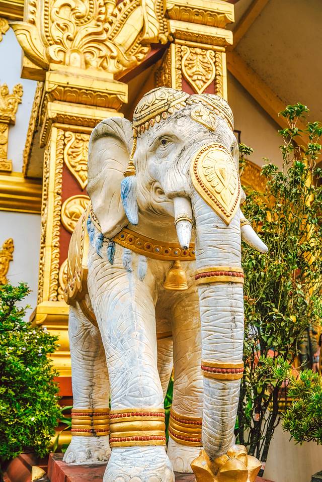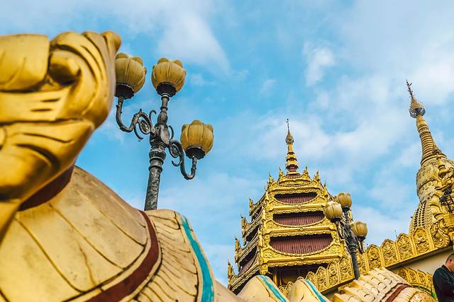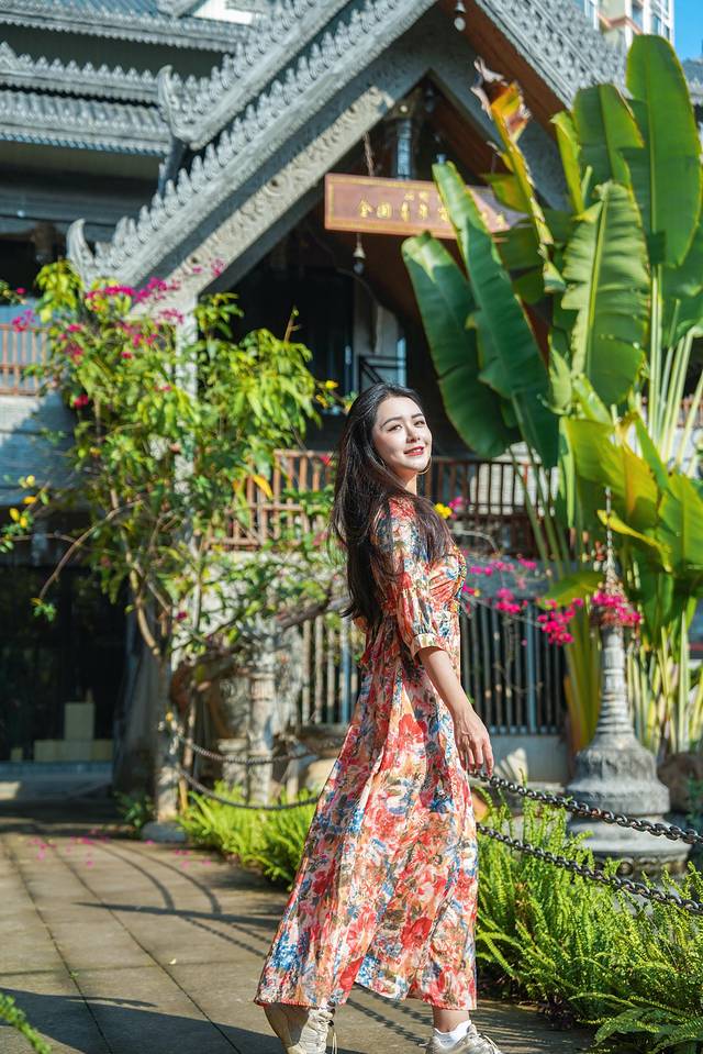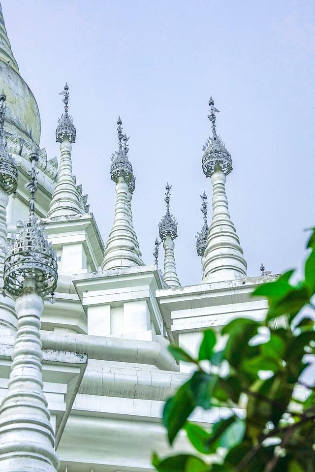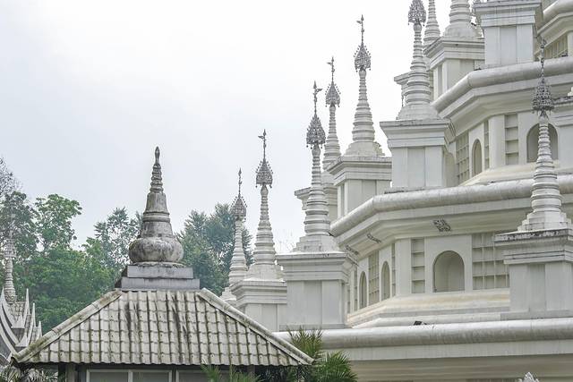 下了一场小雨后,阳光渐渐拨开云雾穿透下来。纯白的塔身在蓝天下熠熠生辉,七层塔檐如莲花般次第绽放,塔尖的宝瓶在阳光下流转着细碎的金光。与对面金碧辉煌的勐焕大金塔不同,银塔的美是内敛的,像一首素雅的梵呗,需要静下心来细细品味。
