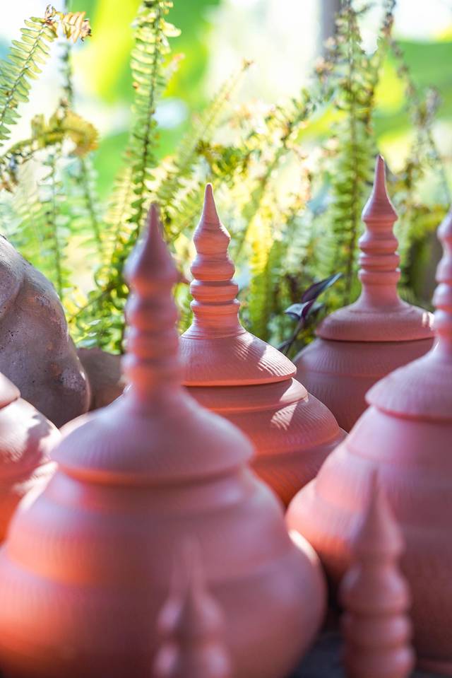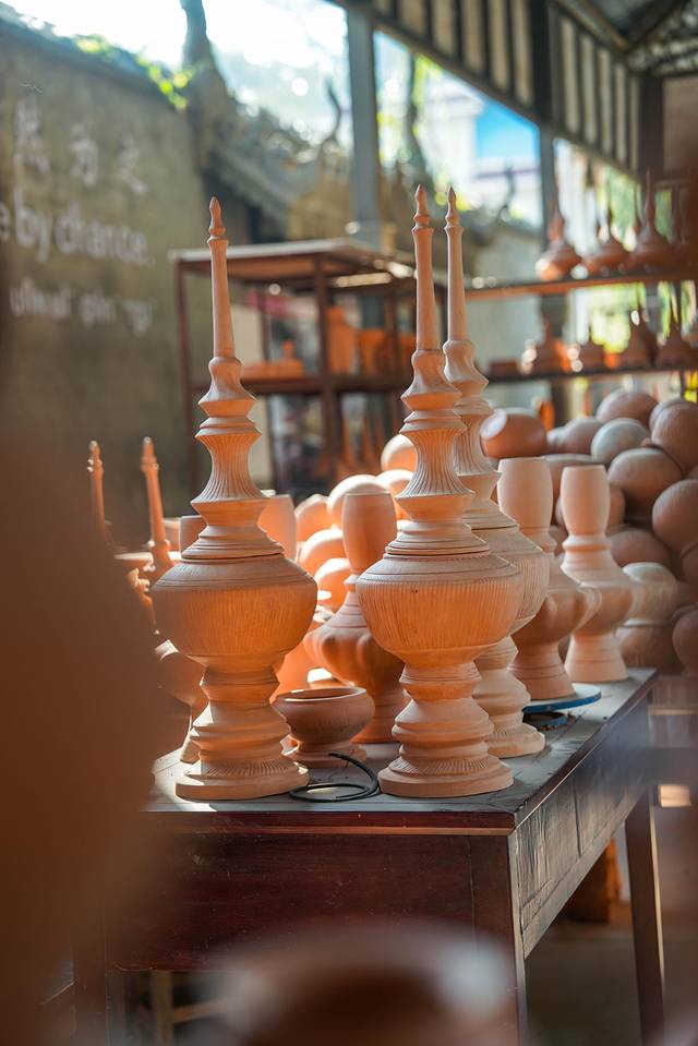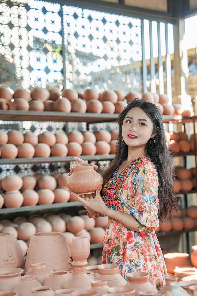 张玉工作室,这里有特别资深专业的傣陶老师。走进基地,仿佛进入了一座活态的土陶博物馆——造型古朴的陶罐、图案精美的陶碗、颇具特色的陶制饰品...每一件作品都诉说着傣族先民的智慧与生活。园内的建筑设计风格也是傣族风情,水池中游泳的鱼儿颇有生机。