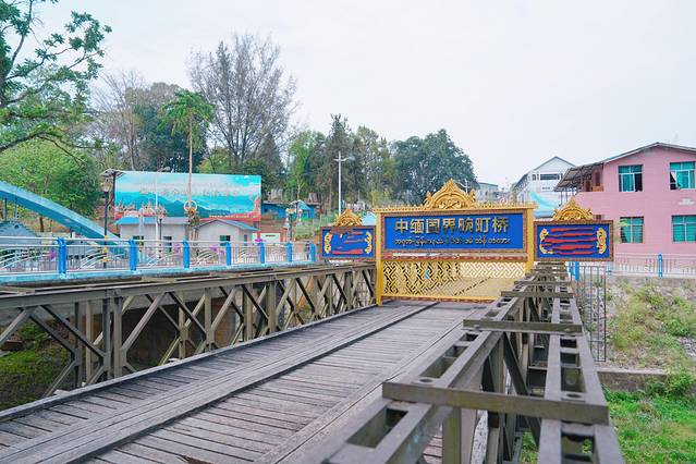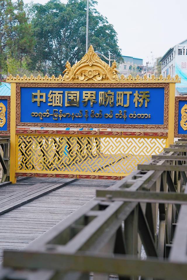 这座仅20米长的钢架桥横跨九谷河,桥面铺着陈旧的木板,踩上去发出轻微的吱呀声,仿佛在诉说80多年前滇缅公路上的车轮滚滚。桥中央一道黄线,左侧是中文“中国”,右侧是缅文“缅甸”。