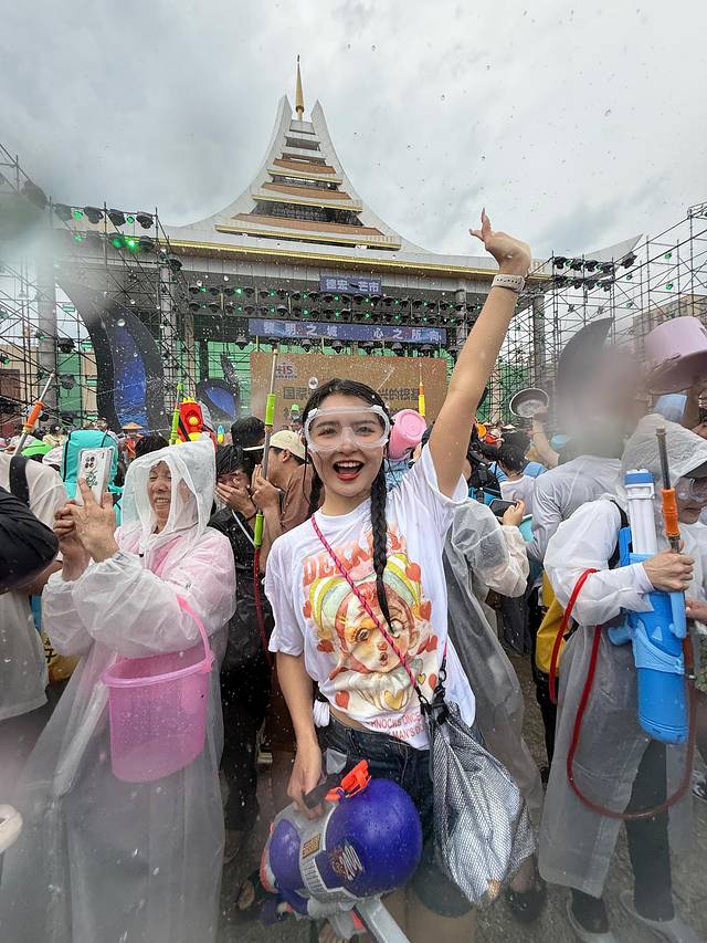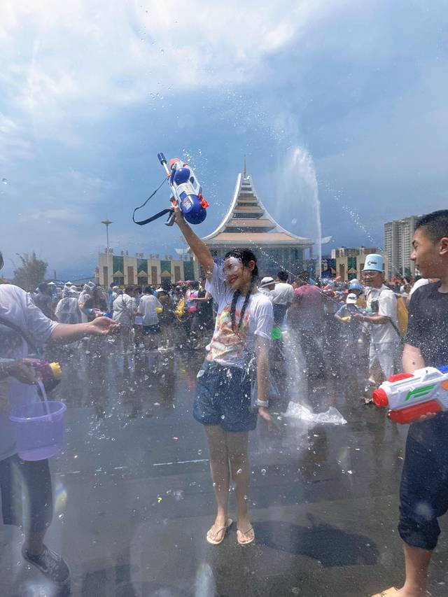 下午我们齐聚芒市广场,此时早已人声鼎沸。这里是泼水节的“主战场”,大家都在等待着主舞台一声令下的开启泼水节仪式。随着主持人一声“开幕!”,数十米高的水柱从广场中央喷涌而出,人群瞬间沸腾——水桶、水枪、甚至消防车的高压水炮齐齐上阵,清凉的水花在空中划出无数道弧线,折射出七彩的光晕