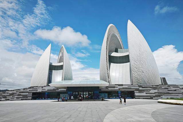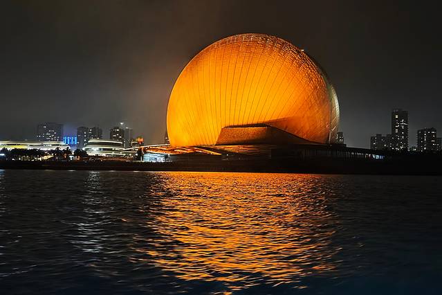 野狸岛上的日月贝,白天是圣洁纯白的艺术殿堂,夜晚则化身光影迷宫,女儿在贝壳状的建筑间欢快奔跑,清脆的笑声与海浪声相互响应,谱写出一曲欢乐的乐章。