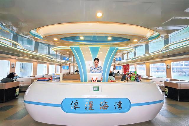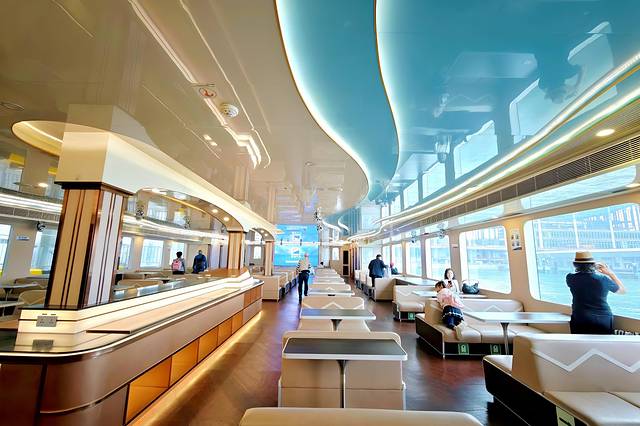 游轮内别有洞天,共分三层,一层为舒适客座区,蓝色天花板宛如翻涌的海浪,营造出沉浸式的海洋氛围。母亲倚窗感叹“这比年轻时坐的渡轮舒服多了”;