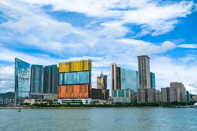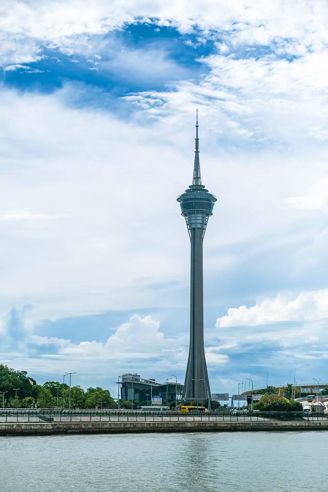 左侧,澳门塔直插云霄,金碧辉煌的建筑群在阳光下闪耀着斑斓的光芒;