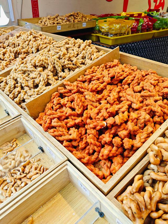 手工非遗小麻花店铺,有时候还可以看到现场炸小麻花和油花花,很香酥,口味也很多,小麻花多达11种口味,油花花也有3种,而且可以免费品尝~