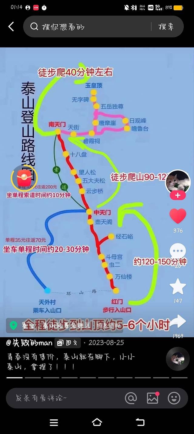 我是按“红门到中天门-十八盘-南天门-玉皇顶”这条路线走的。 体力好点的可以刷速看日出,不着急看日出且体力不是那么好的就可以慢慢爬。我是当时22:40开爬,3:10爬上山顶花了4小时30分钟。算快但是很累,我是很久没有运动过了。有点韧带拉伤和肌肉酸痛,下山脚都是软的