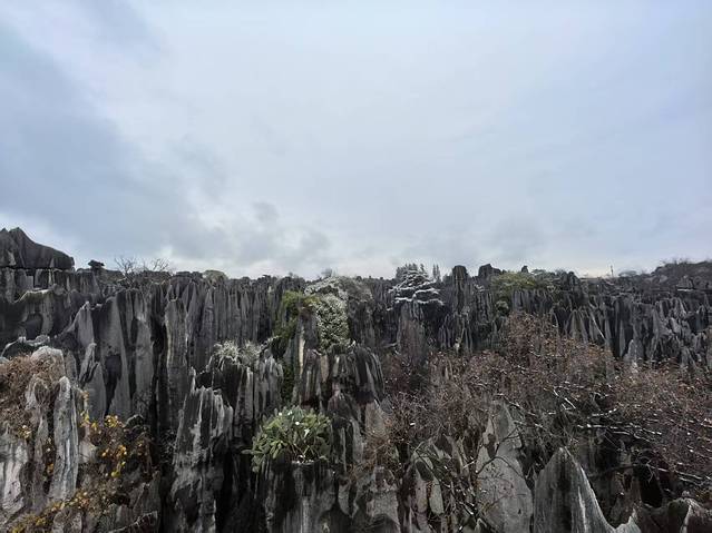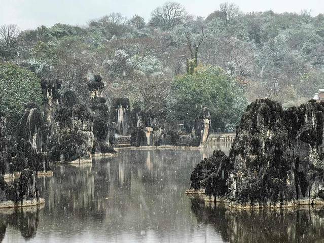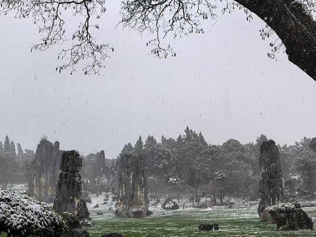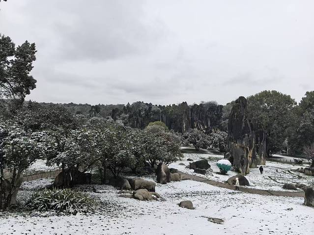 昆明一年四季如春,下雪更是少见,但我们有幸碰到了。前一天在西双版纳穿短袖,当天在昆明穿羽绒服。虽然下着雪,但来都来了,石林还是要去的。