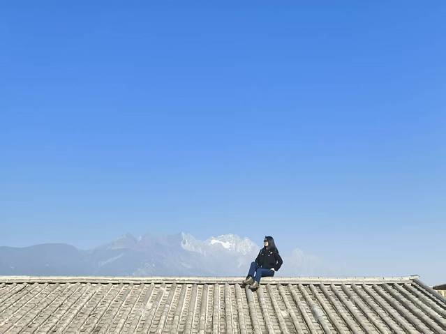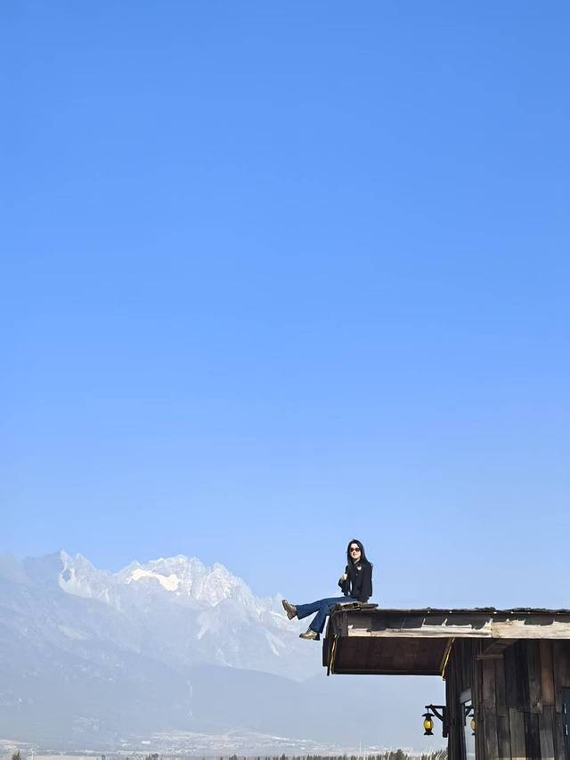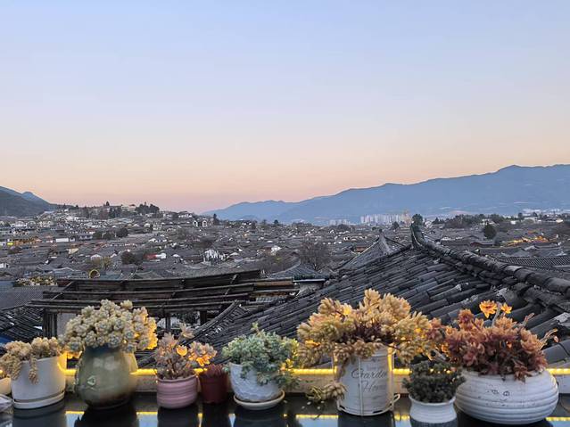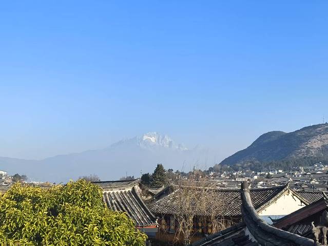 住宿老板诚我不欺,真的在酒店的空中花园看到了玉龙雪山雪景。要不是要赶赴下一个景点,都想在上面坐一会儿,喝杯茶了。