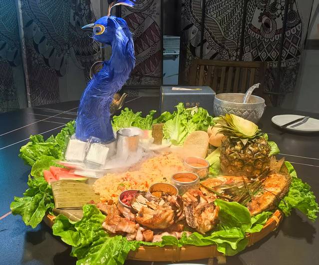 西双版纳的特色餐饮之一就是孔雀饭,很多店铺都有,大同小异。我们在某点评上随便找了一家店,人特别多,座位在后厨旁边。看着工作人员将剩余饭菜倒进桶里,又将盛饭工具(孔雀头和筛子)放一边,感觉他们都不会洗,就又拿上来装新的饭菜了。