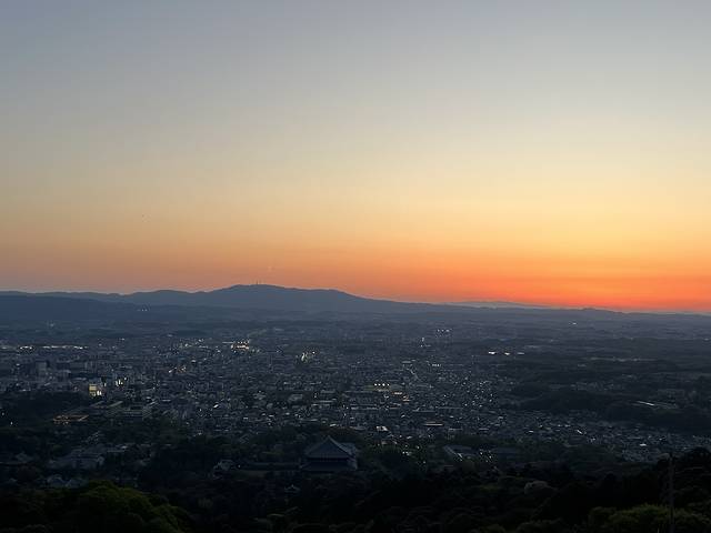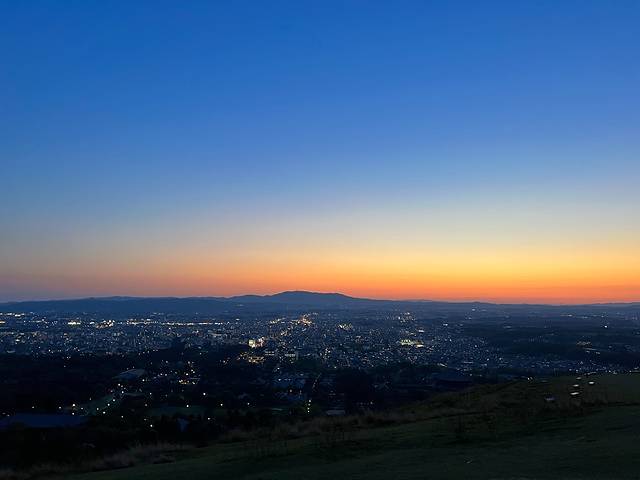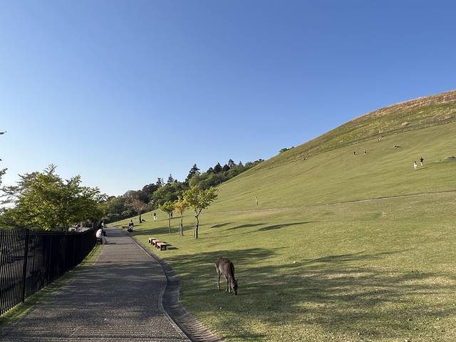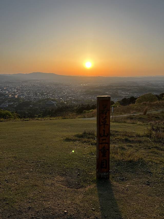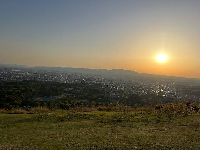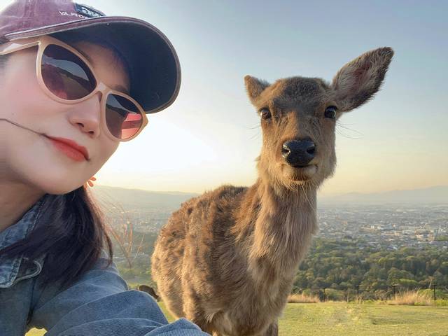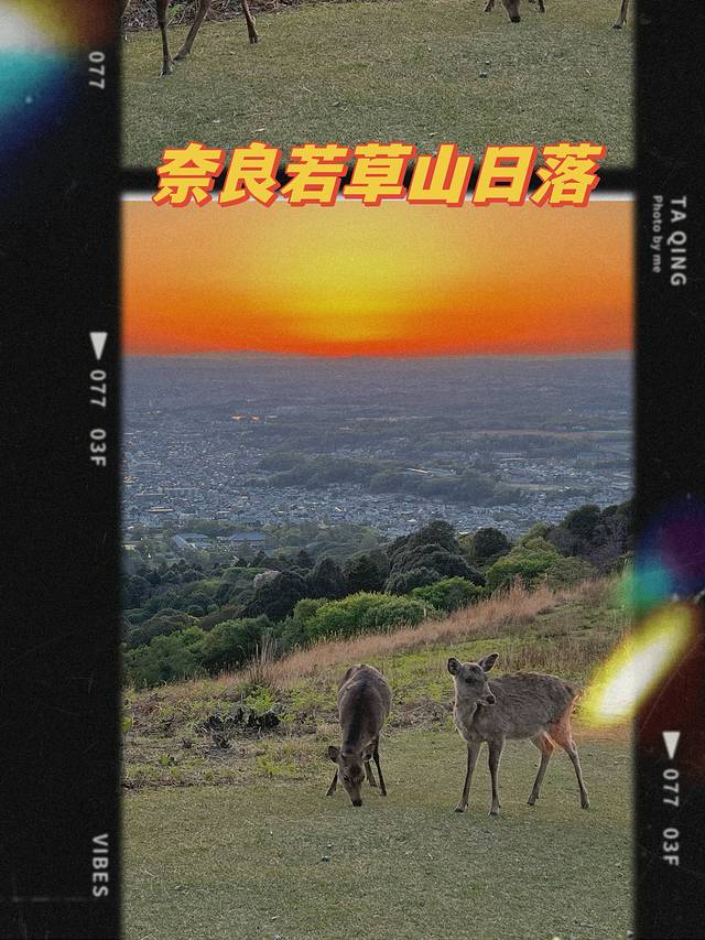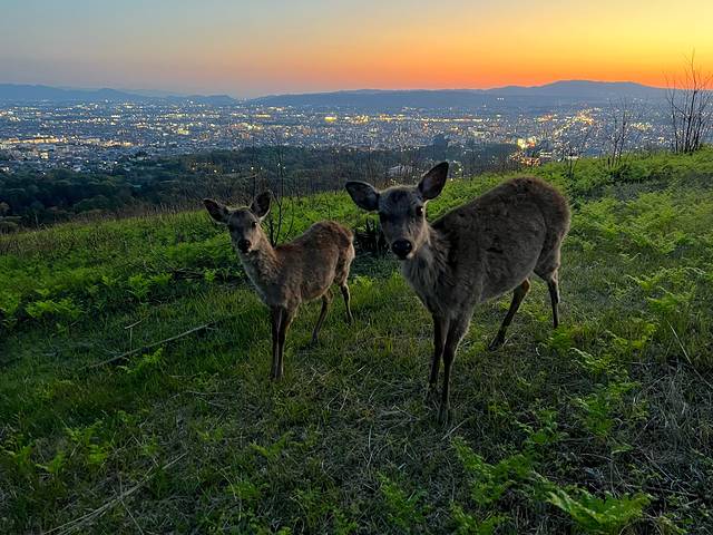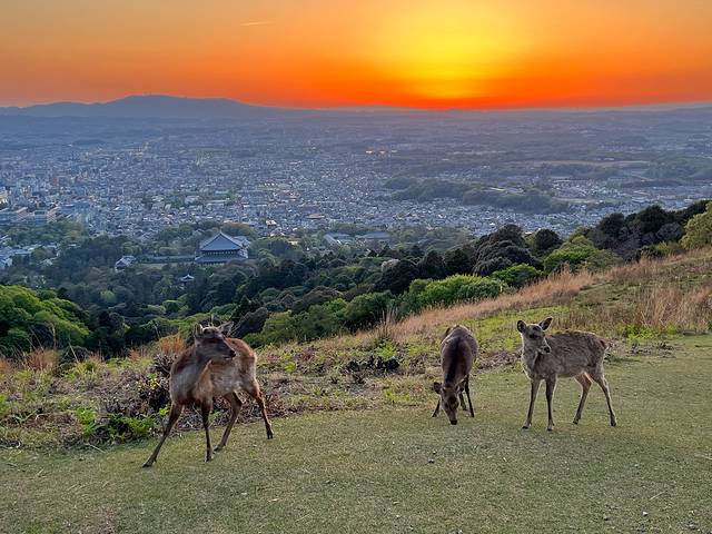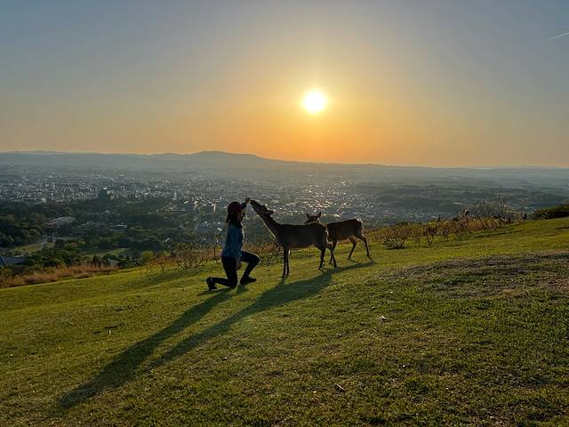 吃完去春日大社,一路步行上若草山。16:55到若草山赶在17:00停止入园前到,从左边上山,一大片草地的山坡,都是小鹿拍照好看,往山上走很累,都是高台阶。