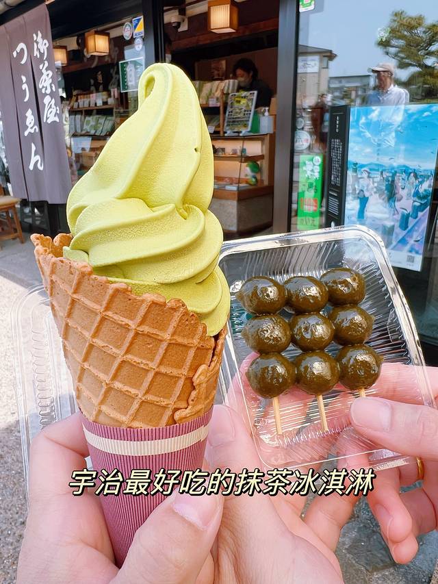 天气很热买了抹茶冰淇淋,味道一般抹茶不如宇治的好吃。