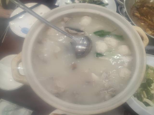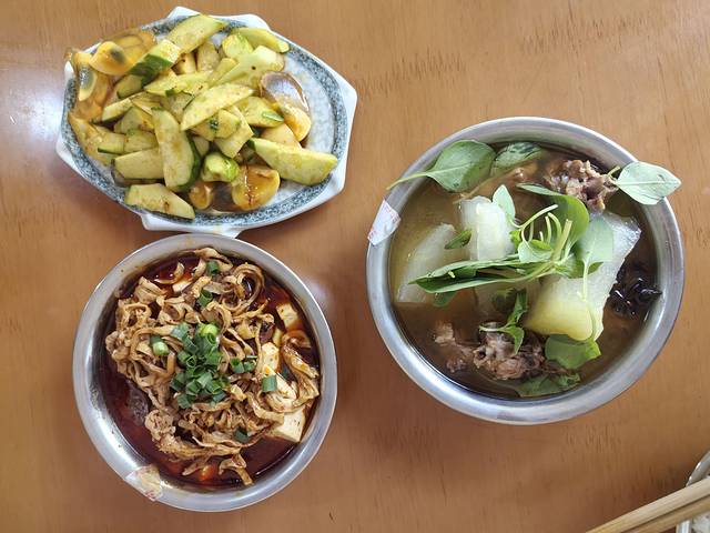 左下就是大肠汤,虽然我不能吃,但是看看也不是不可以,还有老板和店里顾客都推荐的黄瓜变蛋,感觉像皮蛋但也有些不一样。味道嘛,对我们来说有点偏咸了,后来发现这边的菜普遍偏咸,不过确实便宜啊,这三个菜(右边是冬瓜鸭汤)才四十多。