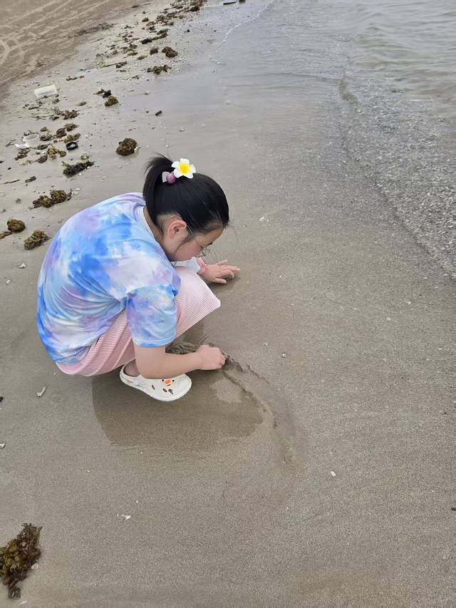 不管多大的孩子,见到沙和水就没有能走动路的。我们在这里抓到不少寄居蟹,但是我忘记拍照了,小小的很难找。一定要带洞洞鞋,保护脚脚。
