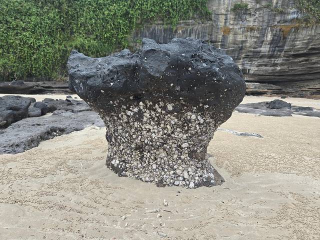 这个岩石下部全是贝壳,其实也在告诉我们,平时海水一般是淹到哪里的。