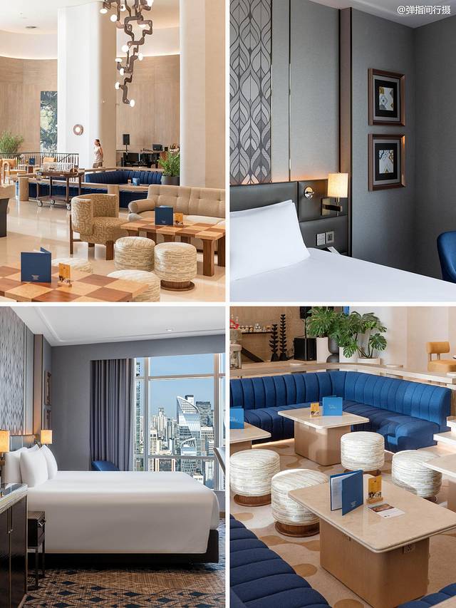 酒店大堂以浅暖主调与挑高设计彰显奢华,大多数客房均配备全景落地窗,可俯瞰曼谷天际线。我此行入住转角客房,景观很漂亮,泡在浴室独立浴缸即可饱览繁华城景,客房细节尽显泰式优雅。