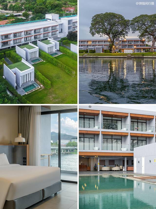 当晚入住河畔酒店,桂河的柔波在窗外交织成绸缎,Raintree Boutique and Pool Villa以现代极简美学悄然栖身于河岸密林间。15栋独立别墅如同散落的珍珠,柚木外墙与藤编家具勾勒出热带当代美学,私人泳池倒映着流动的云影,池畔的鸡蛋花树在晚风中洒落香雪。