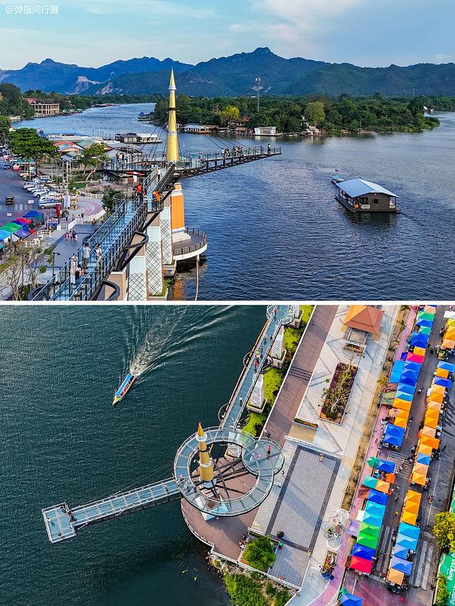 抵达北碧府,首站打卡2022年开放的悬于桂河15米高空,150米长的全透明玻璃桥。漫步其间,黄昏时分,还能邂逅美丽日落。脚下双色河水在暮光中缠绵,远处长尾船划开金色涟漪。下来后恰巧碰上周六市集,各种商品琳琅满目,物美价廉,20泰铢的青木瓜沙拉、50泰铢的手工编织包,市井烟火恰是另一种疗愈。