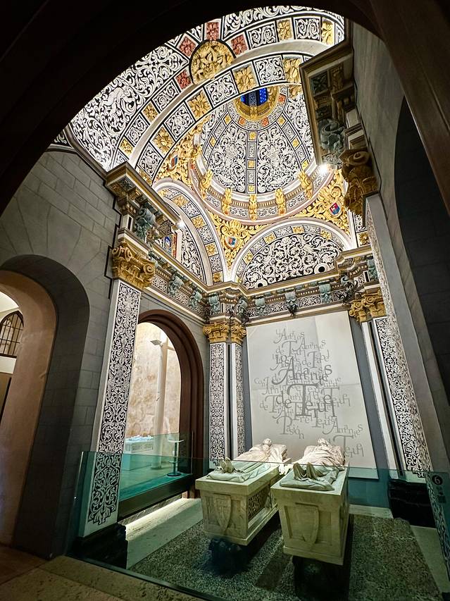 走进特鲁埃尔情人墓室看浮雕,现场的光线已经给人一种很破碎的精致美感,虽然是全世界统一的狗血剧情但听完这个情人故事还是有点被虐到——13世纪的富家女vs穷小子相爱,男主参军凯旋时得知女主已嫁他人后心碎而亡,女主上前吻别时便猝死在身边,很逼真的石膏雕塑让两人离世前伸手相牵但仍握不住,他们的尸骨就埋在石膏雕塑之下……啊这,果然意难平才是顶级的浪漫!