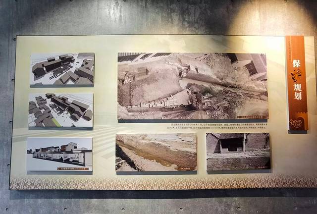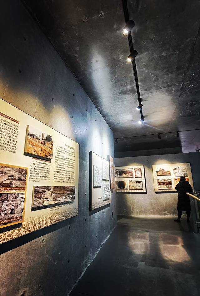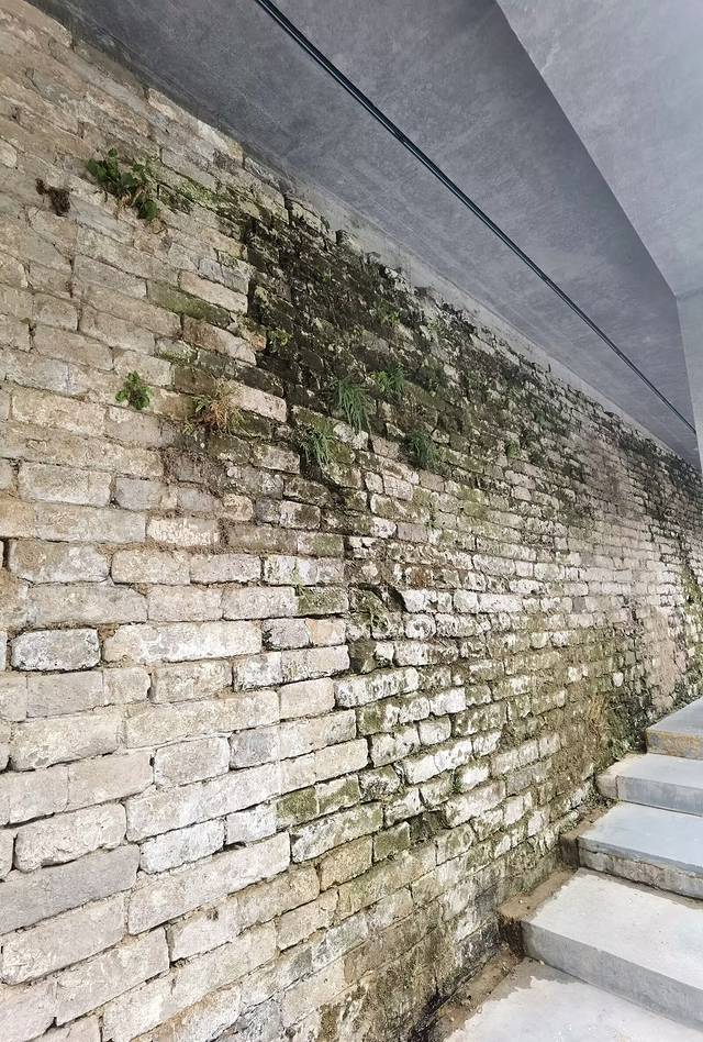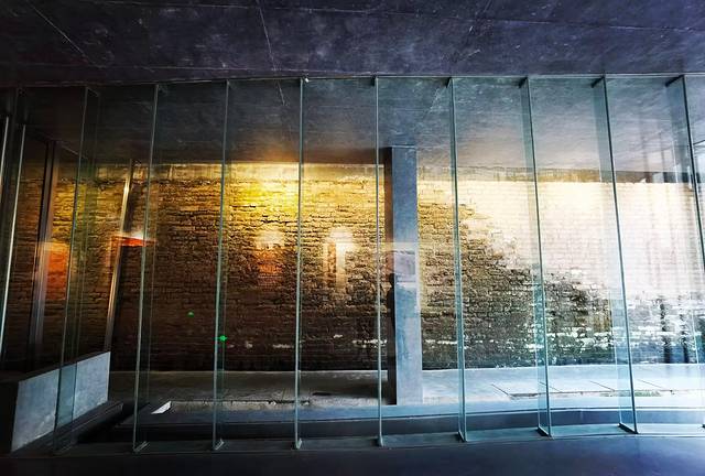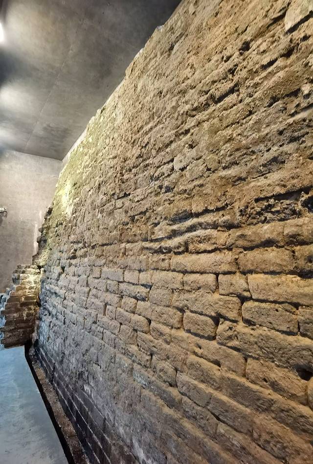 2、实物展示。实物展示的为明代城墙,这段明代城墙位于地下0.3-0.8米处,长度近50米,在2014年城市建设施工过程中发现;这段城墙青砖堆砌整齐,局部长满青苔,采用了两侧包砖、中间夯土的包砖结构,发掘时保存完整,经考证,这段城墙已沉埋地下600多年。