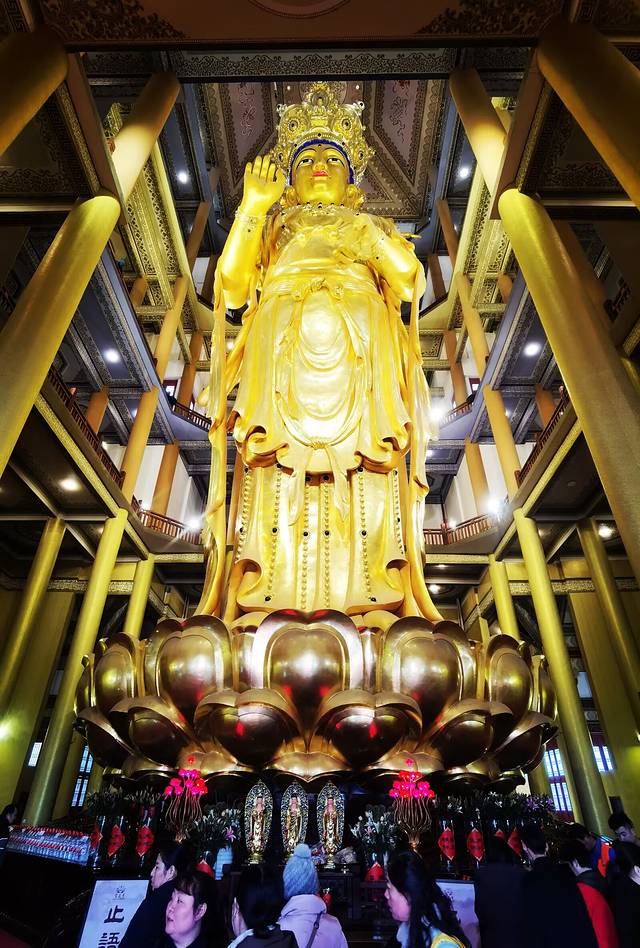 3、天冠弥勒佛像|目前中国最大的室内锻铜佛像。这尊佛像高度39.88m,以印度弥勒为原型,头戴天冠、身披璎珞,身材修长、衣冠飘逸,立于通天阁内,佛像头部是铸铜贴金,身体是锻铜贴金,共有四千多块铜片焊在一起,这些焊缝加在一起就有40多km,围绕着佛像下面的莲花宝座有5.5m高,莲花宝座的下面有一个地宫,地宫里供奉了一颗观音的真身舍利,是2010年奠基的时候放进去的。