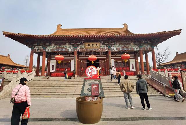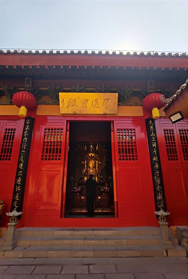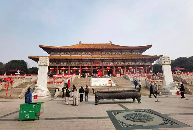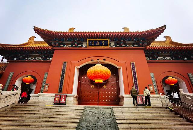 1、大雄宝殿|目前中国最大的大雄宝殿。大雄宝殿也称为七佛殿,建筑面积2377㎡,高度26m,殿内供奉的是释迦牟尼佛和释迦牟尼佛成佛前的六位佛,所有的佛像均采用中国传统的脱胎佛像制作方式,就是在传统的朱、黑等漆色基础上,用真金、真银碾成金粉、银粉作调和料,这样子的漆色经久不变,保存时间较长;大殿顶部的宝相花是一大看点,这个宝相花为北京故宫博物院的一些老专家们纯手工绘画的,这种花形为大唐寺庙里专用的一种花形,现在只有在敦煌的莫高窟才可以看得到。