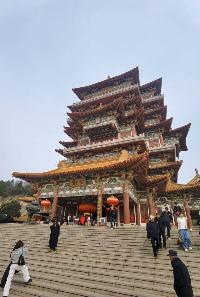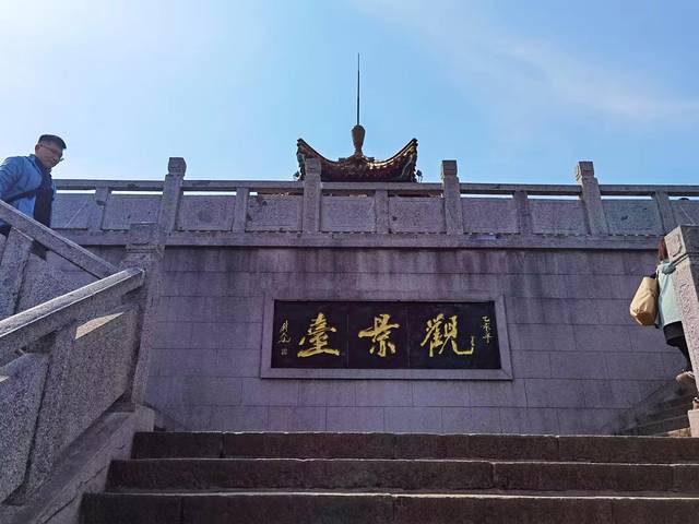 现在的南天门有一座地标性建筑——琅琊阁,这座高阁傍山而建、傲立峰顶,从东面去看,高阁有3层,从南面去看,高阁有5层,其实!阁高24m,共7层,地下2层、地上5层,每层呈六面八角,阁顶为琉璃瓦覆盖。登阁远眺的时候,刚好风起,和煦山风在耳畔的轻柔蜜语,梁角铜铃在风中的叮咚呢喃,真正可以体验一把“山光悦鸟性,潭影空人心”、“会当凌绝顶,一览众山小”的古诗中的独特意境。