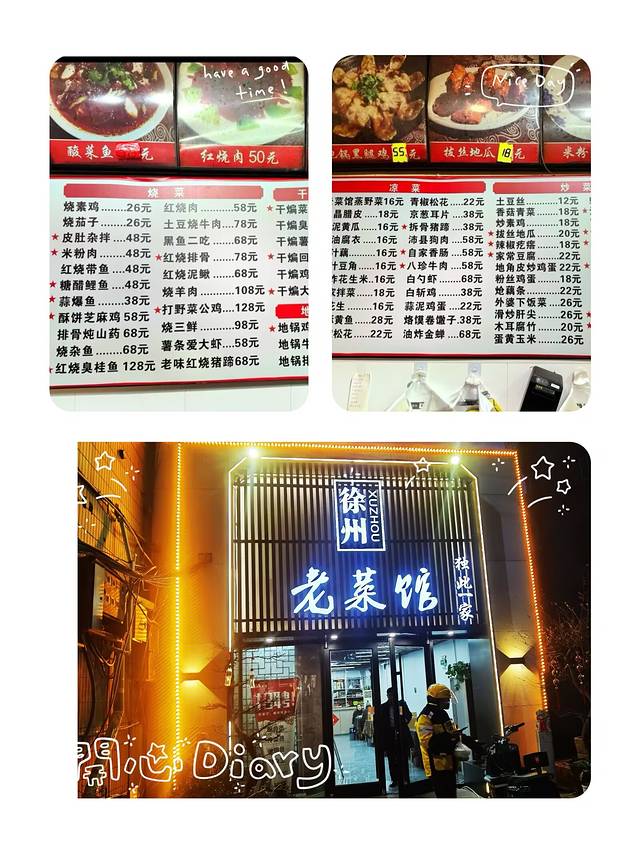 有点难找,其貌不扬的这家私房菜是徐州的网红馆子,遇到10个徐州人唠嗑吃的,会有7~8个人说到这家馆子,我们去吃了!点了3个菜,老板说:够了!别点了。然后知道我是来游玩的,喜欢吃生黄瓜,还送了一根,最后买单是57r,这个单是我回请徐州老铁的,瞬间脸烫得很!如果有个地洞,钻下去得了。这家私房菜没有山珍海味,都是些家常菜,味道是特级大厨烧不出的姥姥的味道,欠缺的就是环境不是很好。综合各项考评指标,这家私房菜我给★★★★★。