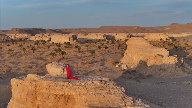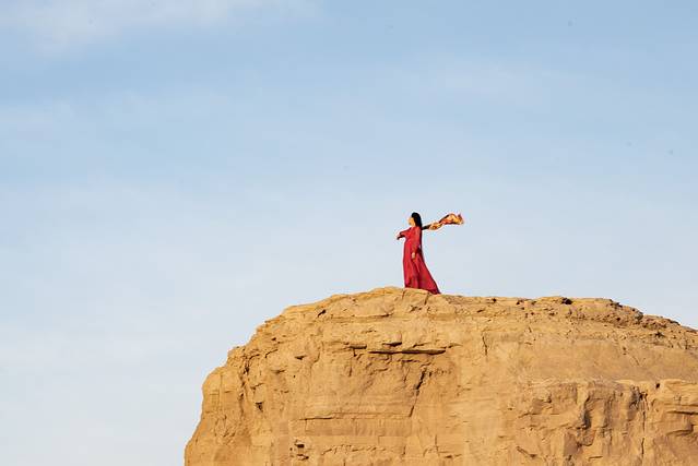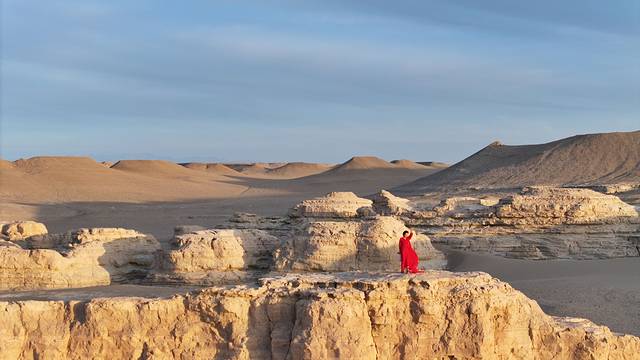 今晚的饭我吃得格外匆忙,因为我要拍红裙日落。几天来全副武装的防晒就为此刻的绽放,这几天因为武装到牙齿,好几个伙伴说“都不知道你长啥样”。伙伴们见到我一席长裙从帐篷里走出来,发出阵阵惊叹,当然,惊叹是给美丽裙子的。 登上雅丹地貌的顶,长裙和飘带在风中飞扬,夕阳将雅丹地貌群染成金黄色,红裙带融化在夕阳中,瞭望无边沙漠,我和所有的胡杨树,成为了跨越时光的伙伴,共同投入夕阳的赤橙环抱。海林、龙儿用两台无人机帮我记下来这绝美的时刻,【这大漠极致绝美的时刻】。