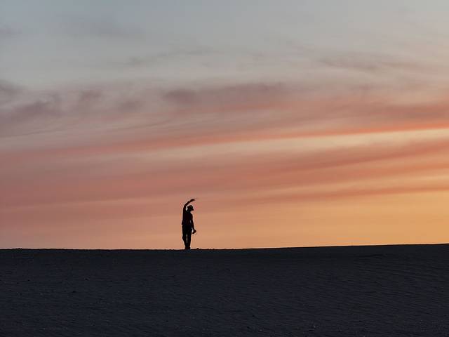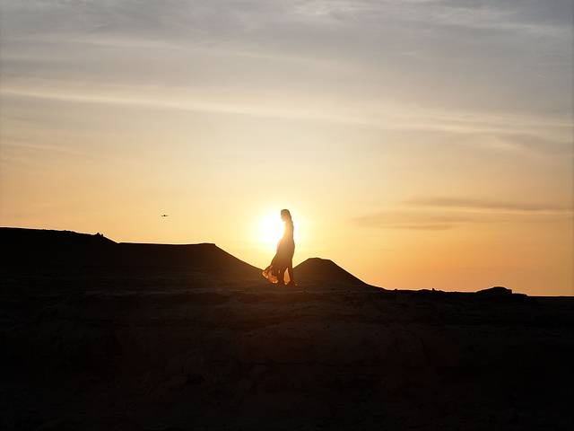 夕阳过后,晚霞更绝。让远处的雅丹轮廓清晰,背景绚烂。我忍不住向着晚霞奔跑,在沙石上奔跑,柔软而有力量,我贪婪地踩踏着沙漠,肆意的呼吸着空气,让困顿在车内的双腿充分地发挥,让它迎着晚霞逐日,【这是向往的时刻】,向往极致,极致的向往,大爱这个时刻。