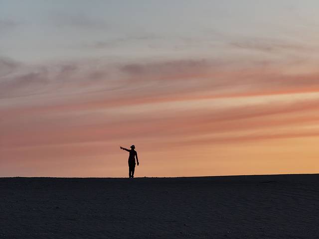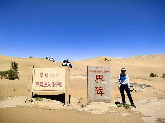 终于没那么热的时候,留下大厨们烧火做饭搭帐篷,车队一行打卡了望舒村一号大本营和牺牲在罗布泊的国家科考队队长彭加木的祭奠碑(为了不鼓励大家冒险来祭奠,政府已经把祭奠碑改成了“严禁进入无人区”的警示牌);我对这段历史并不熟悉,我心心念念的是赶在日落前回到营地,是穿上大红长裙和日落合影。果然,不出意外的话意外还是发生了,司机小虎的车又陷了,救援不太顺利,看着着急“回家”的太阳,我更心急如焚,且随着日落,温度下降,沙漠开始起风了,细腻的沙子排成一列一列,整齐地飞驰,原来飞沙走石还能这般有秩序,有点纪律部队的感觉,不过这漫天部队滚滚袭来,还真是【极为震撼的一刻】。