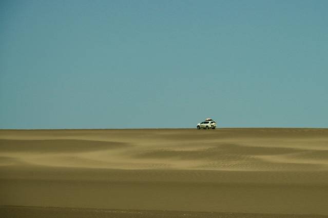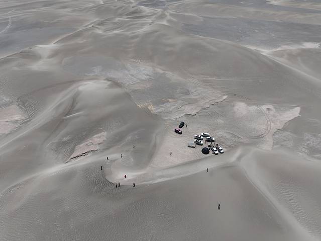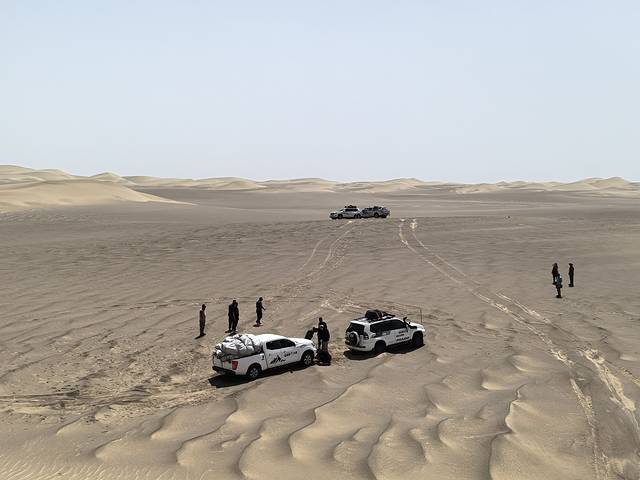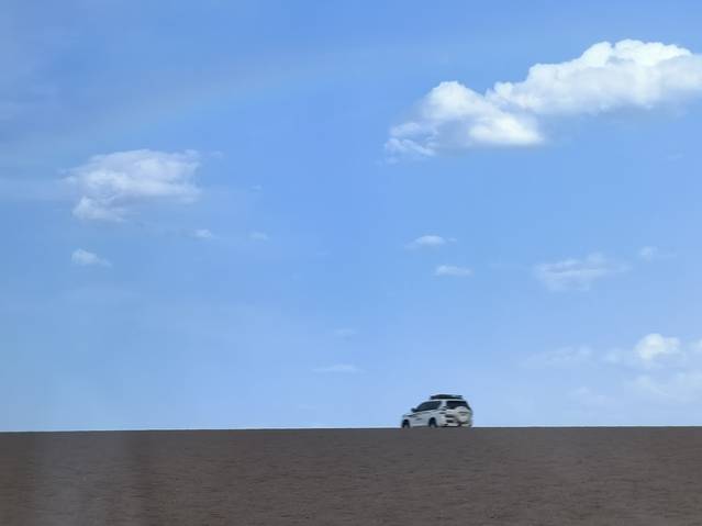 追着夕阳奔跑,迎着早阳出发,最后一天,我们要离开无人区。大概是罗布泊舍不得我们,离开的一天尤为不易,其中一台负责保障的皮卡车,从坏到只能一档前进到彻底失去动力,头车得一路拉着它。头车是头羊,我们老龚的车,就像是牧羊犬,要确保每台车都没掉队,老龚一路精神都高度紧张,总是不停观望每个车的位置。这一天,因为头车拉着没有动力的皮卡不能停,我们的车一直在探路、开路,很多地方来来回回探了很多次,我在车上也很疲劳。不幸的是,没有动力的皮卡车还是一再沦陷,因为沙丘起起伏伏,过峰动力不足会陷,沙地沙质太软会陷,上坡太陡会陷,拐弯太急会陷,出了保护区路好像被河水冲断了一般,很多沙丘的背后就是90°垂直的“悬崖”,拖着一部没有动力的车在这样的地质环境中行驶,不得不说太艰难了。一直在拖拽,在探路,在救援。再难,也不能放弃任何一个队友,也许这就是团队精神吧。